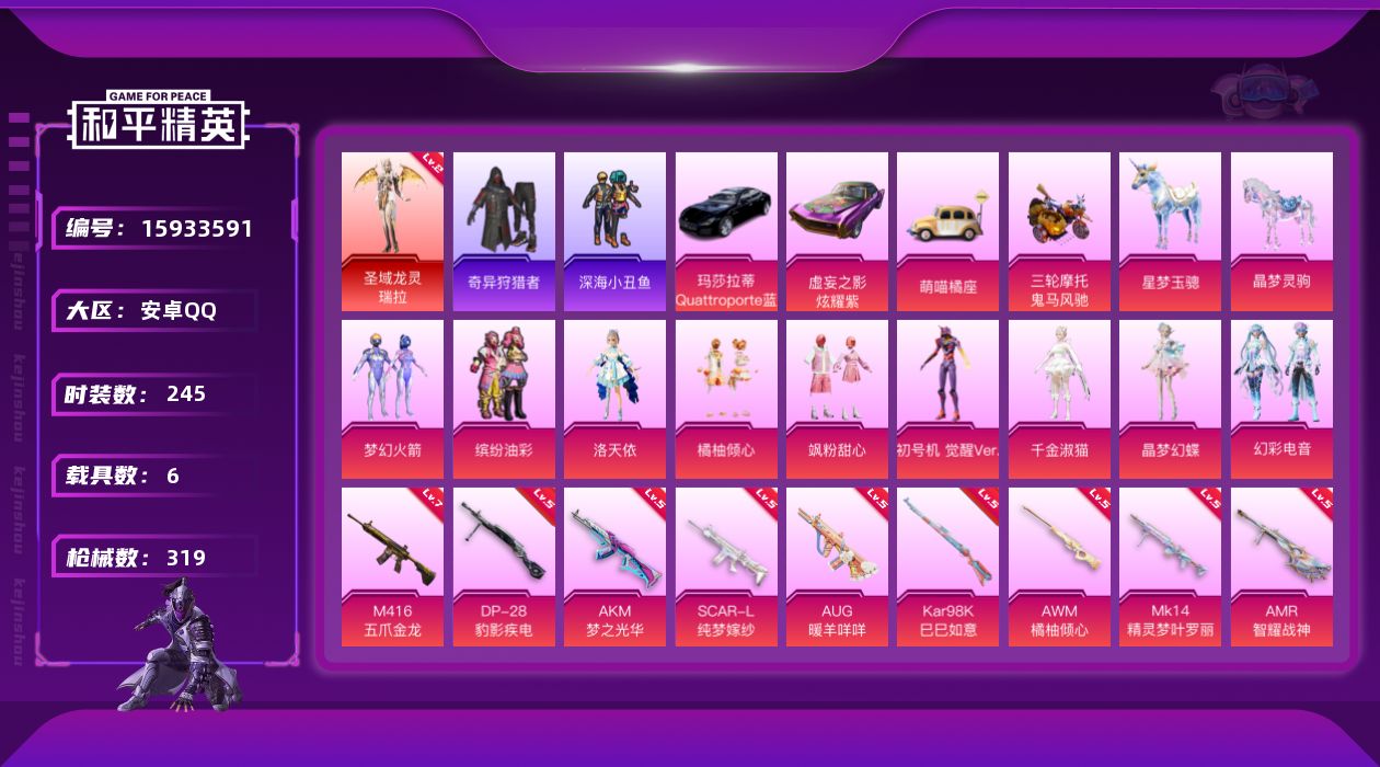 [15933591]【特价出售/店主推荐】安卓 手Q-1神装-9粉装-12特效枪-6载具-6粉色飞行器-112676热力值-15王牌印记-245套装-319枪皮【红色神装等级】:圣域龙灵-瑞拉(二级)【红色角色神装】:圣域龙灵-瑞拉【热门品类】:粉装-梦幻火箭,粉装-缤纷油彩,套装-深海小丑鱼,套装-小丑鱼,套装-奇异狩猎者,套装-龟仙人,套装-暗影哥特,角色-8号机,角色-Mark.06,角色-六号稻草人【粉色套装】:粉装-梦幻火箭,粉装-缤纷油彩,角色-洛天依,粉装-橘柚倾心,粉装-飒粉甜心,角色-初号机 觉醒Ver.,角色-千金淑猫,角色-晶梦幻蝶,粉装-幻彩电音【粉色枪皮等级】:AKM-梦之光华(五级),SCAR-L-纯梦嫁纱(五级),M416-五爪金龙(七级),AUG-暖羊咩咩(五级),AKS-74U-星穹咏叹调(四级),Kar98K-巳巳如意(五级),Kar98K-圣域龙灵(二级),AWM-橘柚倾心(五级),Mk14-精灵梦叶罗丽(五级),AMR-智耀战神(五级),DP-28-豹影疾电(五级),MG3-洛神天依(五级)【粉色载具】:玛莎拉蒂Quattroporte(夜幕蓝),虚妄之影(炫耀紫),萌喵橘座,鬼马风驰,僚机-萌兔起飞,星梦玉骢,晶梦灵驹【粉色枪皮】:AKM-梦之光华,SCAR-L-纯梦嫁纱,M416-五爪金龙,AUG-暖羊咩咩,AKS-74U-星穹咏叹调,Kar98K-巳巳如意,Kar98K-圣域龙灵,AWM-橘柚倾心,Mk14-精灵梦叶罗丽,AMR-智耀战神,DP-28-豹影疾电,MG3-洛神天依【粉色飞行器】:梦幻火箭飞行器,沙丘之主天马,镜域双华-灵镜之阶,晶梦幻蝶飞行器,圣域金龙飞行器