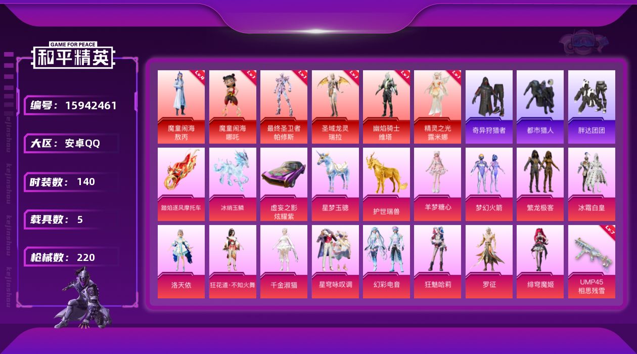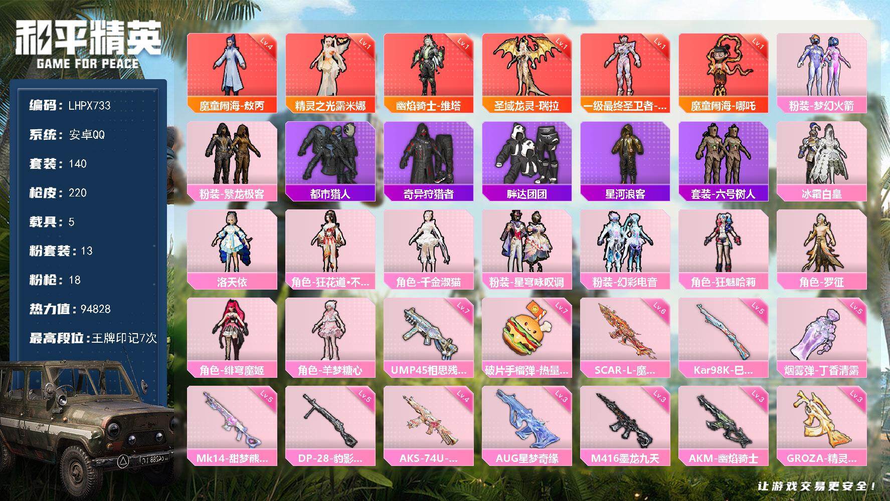 [15942461]【特价出售/店主推荐】安卓 手Q-6神装-13粉装-18特效枪-5载具-18粉色飞行器-94828热力值-7王牌印记-140套装-220枪皮