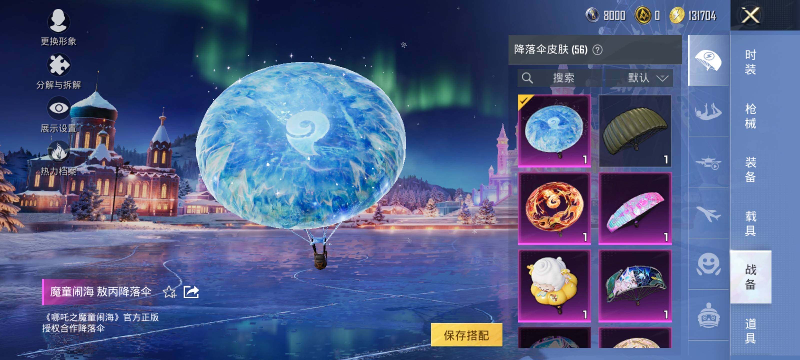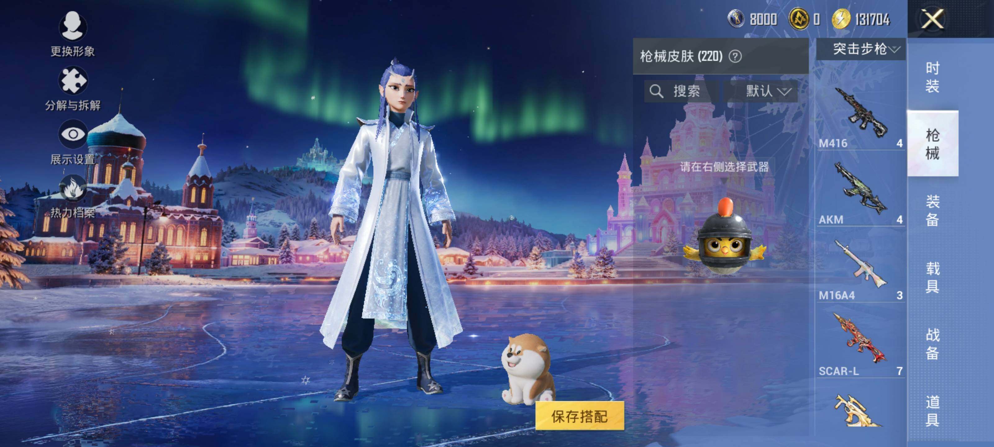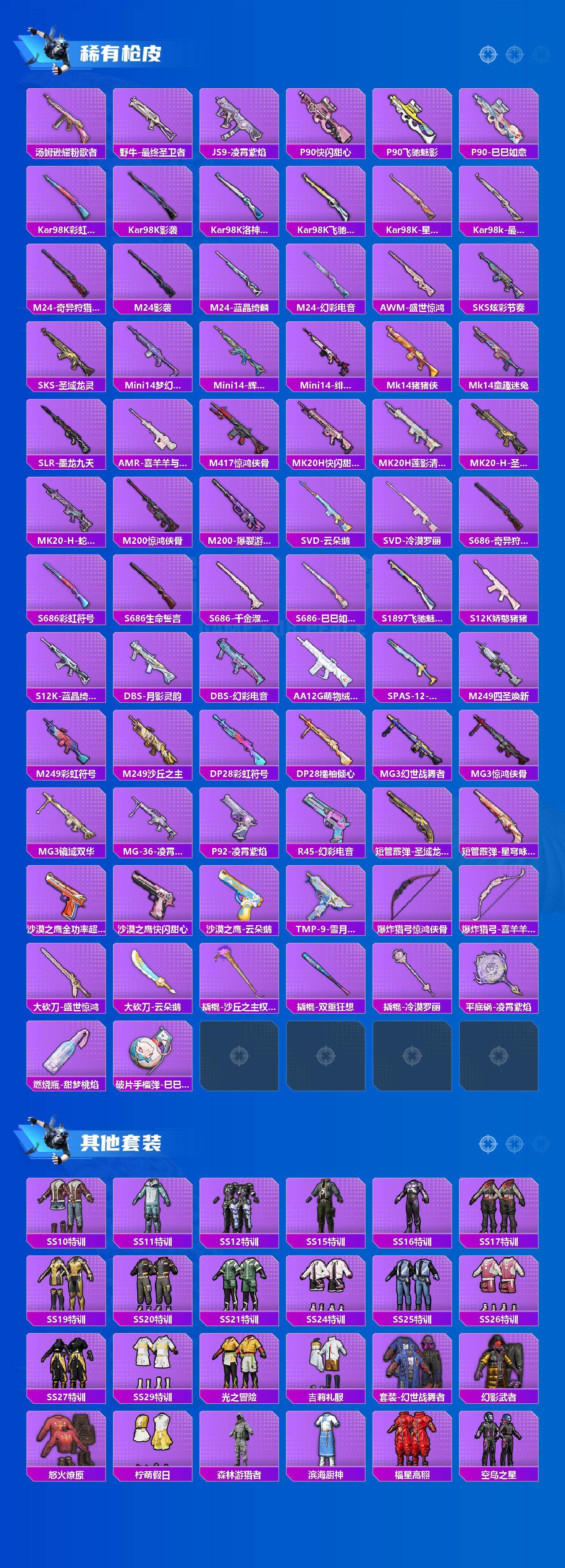 AKM-幽焰骑士,SCAR-L-童趣迷兔,M416-墨龙九天,GROZA-精灵之光,AUG-星梦奇缘,UMP45-相思残雪,Kar98K-巳巳如意,Kar98K-圣域龙灵,烟雾弹-丁香清露,破片手榴弹-热量炸弹