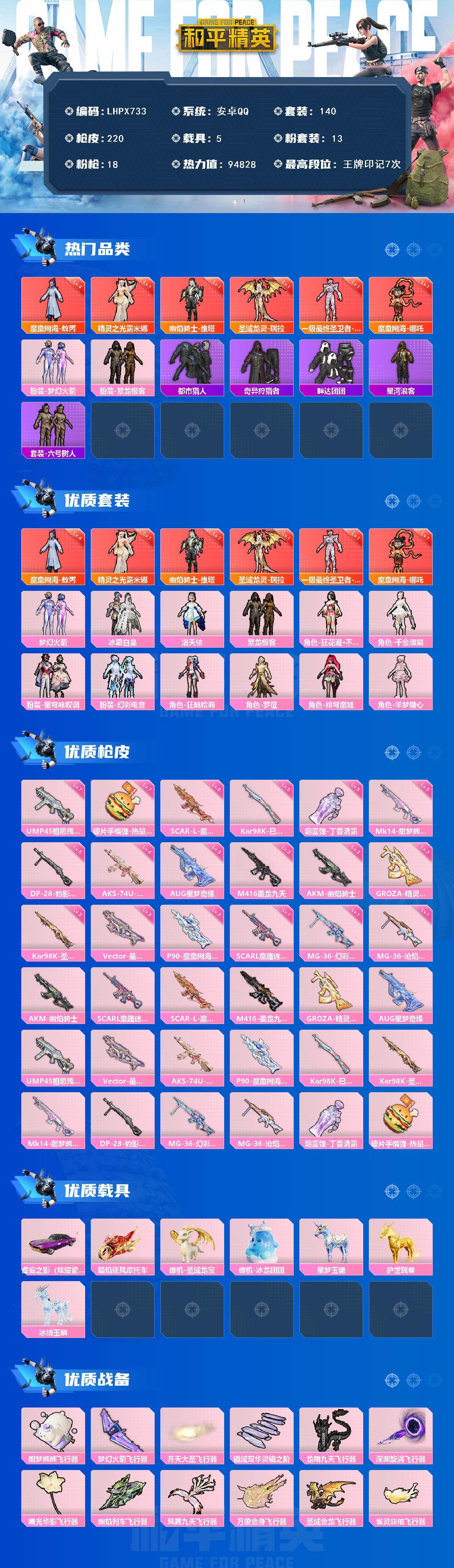[15942461]【特价出售/店主推荐】安卓 手Q-6神装-13粉装-18特效枪-5载具-18粉色飞行器-94828热力值-7王牌印记-140套装-220枪皮 【红色神装等级】:魔童闹海-敖丙(四级),魔童闹海-哪吒(一级),最终圣卫者-帕修斯(一级),圣域龙灵-瑞拉(一级),幽焰骑士-维塔(一级),精灵之光-露米娜(一级) 【红色角色神装】:魔童闹海-敖丙,魔童闹海-哪吒,最终圣卫者-帕修斯,圣域龙灵-瑞拉,幽焰骑士-维塔,精灵之光-露米娜 【热门品类】:粉装-梦幻火箭,粉装-繁龙极客,套装-都市猎人,套装-奇异狩猎者,套装-胖达团团,套装-星河浪客,套装-六号树人 【粉色套装】:粉装-梦幻火箭,粉装-冰霜白皇,角色-洛天依,粉装-繁龙极客,角色-狂花道·不知火舞,角色-千金淑猫,粉装-星穹咏叹调,粉装-幻彩电音,角色-狂魅哈莉,角色-罗征,角色-绯穹魔姬,角色-羊梦糖心 【粉色枪皮等级】:AKM-幽焰骑士(三级),SCAR-L-童趣迷兔(一级),SCAR-L-魔童闹海 哪吒(六级),M416-墨龙九天(三级),GROZA-精灵之光(三级),AUG-星梦奇缘(三级),UMP45-相思残雪(七级),Vector-最终圣卫者(三级),AKS-74U-星穹咏叹调(四级),P90-魔童闹海 敖丙(三级),Kar98K-巳巳如意(五级),Kar98K-圣域龙灵(三级),Mk14-甜梦熊击(五级),DP-28-豹影疾电(五级),MG-36-幻彩电音(一级),MG-36-沧焰双生(一级),烟雾弹-丁香清露(五级),破片手榴弹-热量炸弹(七级) 【粉色载具】:虚妄之影(炫耀紫),踏焰逐风摩托车,僚机-圣域龙宝,僚机-冰龙团团,星梦玉骢,护世瑞兽,冰绡玉鳞 【粉色枪皮】:AKM-幽焰骑士,SCAR-L-童趣迷兔,SCAR-L-魔童闹海 哪吒,M416-墨龙九天,GROZA-精灵之光,AUG-星梦奇缘,UMP45-相思残雪,Vector-最终圣卫者,AKS-74U-星穹咏叹调,P90-魔童闹海 敖丙,Kar98K-巳巳如意,Kar98K-圣域龙灵,Mk14-甜梦熊击,DP-28-豹影疾电,MG-36-幻彩电音,MG-36-沧焰双生,烟雾弹-丁香清露,破片手榴弹-热量炸弹 【粉色飞行器】:酣梦熊熊飞行器,梦幻火箭飞行器,齐天大圣飞行器,镜域双华-灵镜之阶,龙翔九天飞行器,深渊漩涡飞行器,曦光华影飞行器