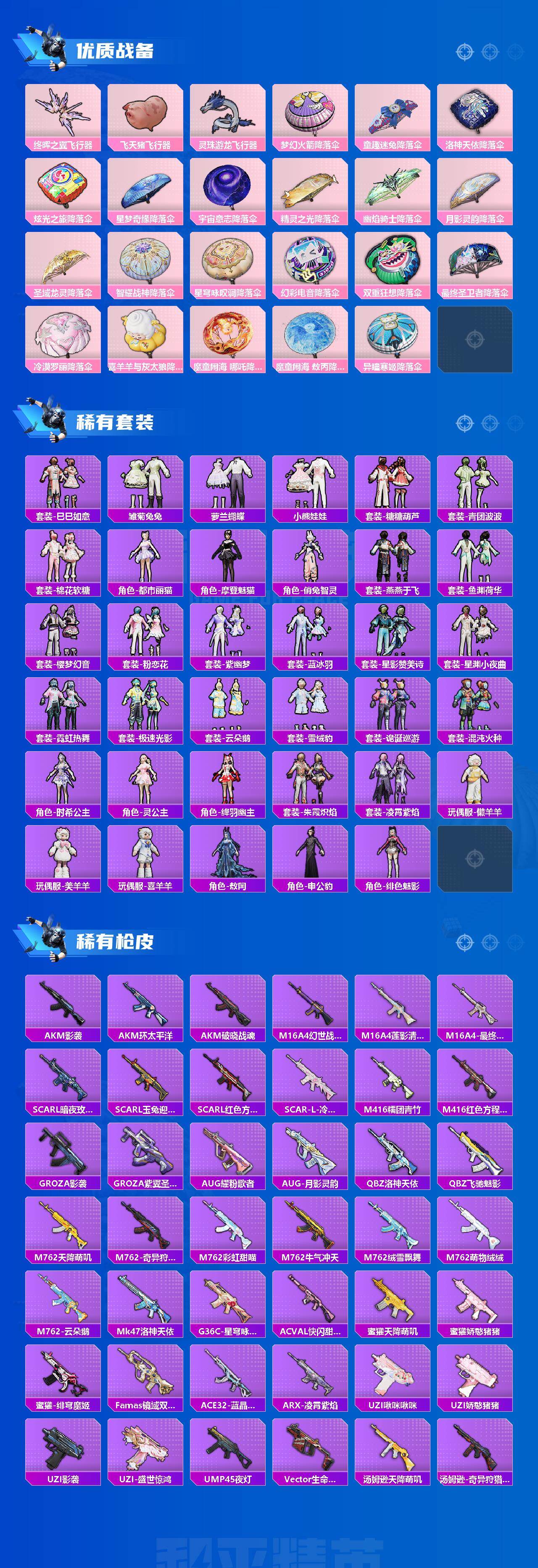 【粉色枪皮】:AKM-幽焰骑士,SCAR-L-童趣迷兔,SCAR-L-魔童闹海 哪吒,M416-墨龙九天,GROZA-精灵之光,AUG-星梦奇缘,UMP45-相思残雪,Vector-最终圣卫者,AKS-74U-星穹咏叹调,P90-魔童闹海 敖丙,Kar98K-巳巳如意,Kar98K-圣域龙灵,Mk14-甜梦熊击,DP-28-豹影疾电,MG-36-幻彩电音,MG-36-沧焰双生,烟雾弹-丁香清露,破片手榴弹-热量炸弹