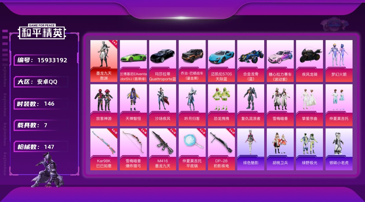 [15933192]【特价出售/店主推荐】安卓 手Q-1神装-10粉装-5特效枪-7载具-3粉色飞行器-55705热力值-11王牌印记-146套装-147枪皮【红色神装等级】:墨龙九天-敖渊(一级)【红色角色神装】:墨龙九天-敖渊【热门品类】:粉装-梦幻火箭,角色-军刀雅典娜,套装-龟仙人【粉色套装】:粉装-梦幻火箭,粉装-放客神游,粉装-天禅智恒,粉装-沙场疾风,粉装-吟月归客,粉装-恐龙拽拽,角色-复仇流浪者,粉装-雪梅暗香,粉装-挚爱序曲,粉装-仲夏莫吉托【粉色枪皮等级】:M416-墨龙九天(三级),Kar98K-巳巳如意(五级),DP-28-豹影疾电(二级),爆炸猎弓-雪梅暗香(四级),平底锅-仲夏莫吉托(三级)【粉色载具】:兰博基尼Aventador SVJ(翡翠绿),玛莎拉蒂Quattroporte(夜幕蓝),乔治巴顿战车(鎏金黑),迈凯伦570S(天际蓝),合金龙骨(蓝),糖心拉力赛车(波动紫),疾风龙骑【粉色枪皮】:M416-墨龙九天,Kar98K-巳巳如意,DP-28-豹影疾电,爆炸猎弓-雪梅暗香,平底锅-仲夏莫吉托【粉色飞行器】:雪梅暗香飞行器,龙翔九天飞行器