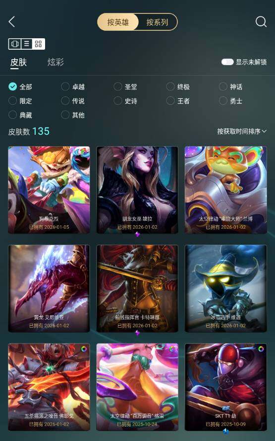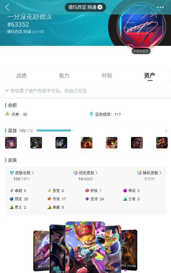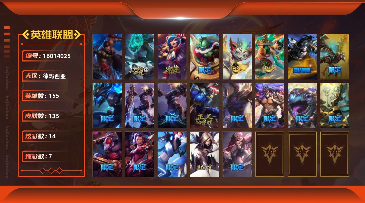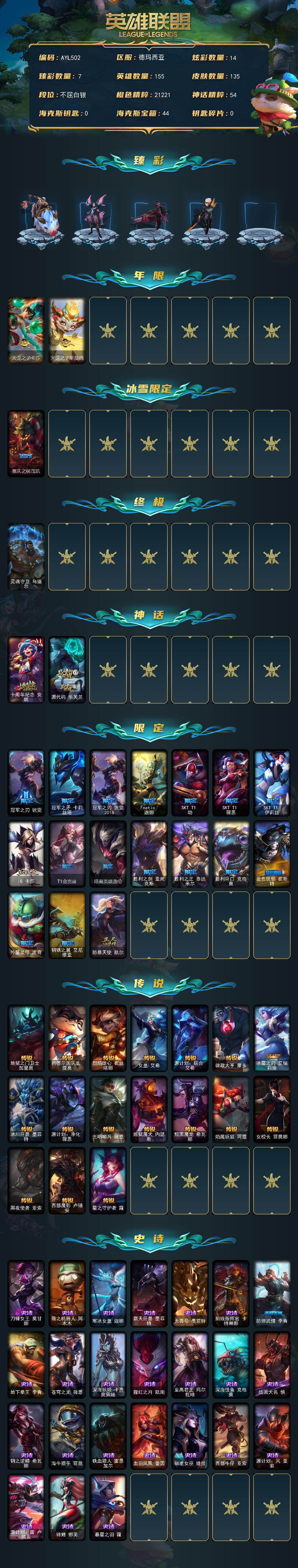 白银段位-155英雄-135皮肤-14炫彩-1终极-2神话-20限定-17传说-24史诗
