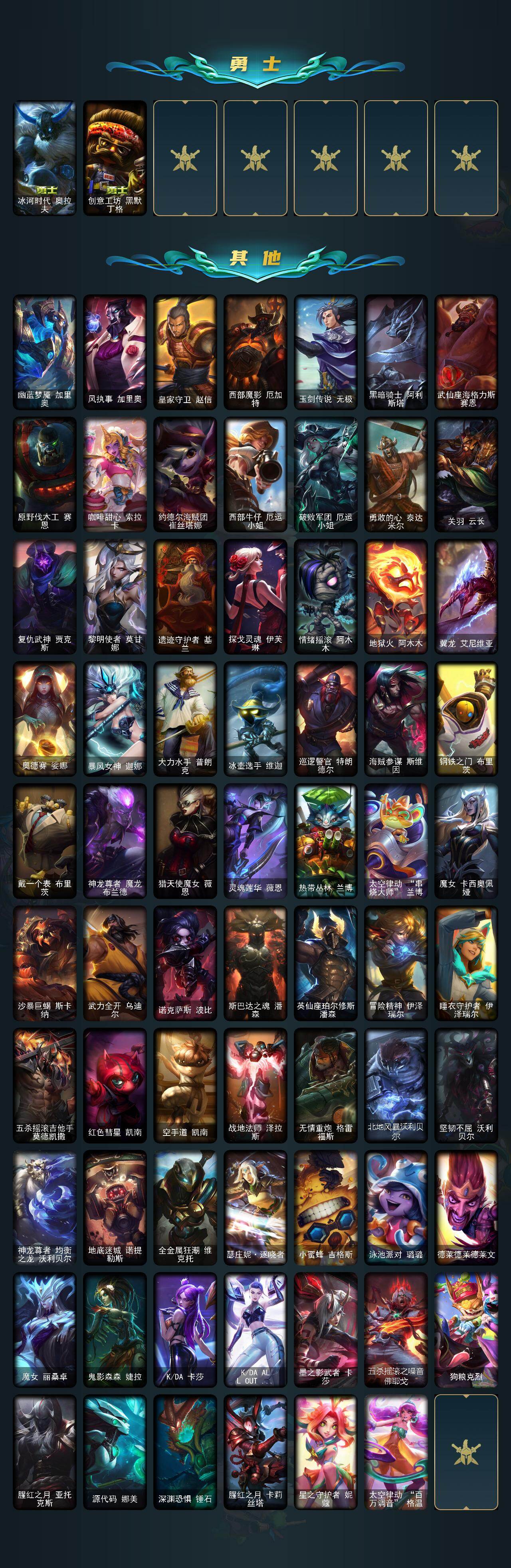 【其他皮肤1】:幽蓝梦魇加里奥,风执事加里奥,皇家守卫赵信,西部魔影厄加特,玉剑传说无极,黑暗骑士阿利斯塔,武仙座海格力斯赛恩,原野伐木工赛恩,咖啡甜心索拉卡,约德尔海贼团崔丝塔娜,西部牛仔厄运小姐,破败军团厄运小姐,勇敢的心泰达米尔,关羽云长,复仇武神贾克斯,黎明使者莫甘娜,遗迹守护者基兰,探戈灵魂伊芙琳,情绪摇滚阿木木,地狱火阿木木,翼龙艾尼维亚,奥德赛娑娜,暴风女神迦娜,大力水手普朗克,冰壶选手维迦,巡逻警官特朗德尔,海贼参谋斯维因,钢铁之门布里茨,戴一个表布里茨,神龙尊者魔龙布兰德,猎天使魔女薇恩,灵魂莲华薇恩,热带丛林兰博,太空律动串烧大师兰博,魔女卡西奥佩娅,沙暴巨蝎斯卡纳,武力全开乌迪尔,