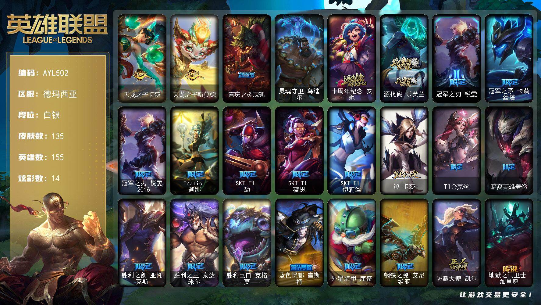 [16014025]【特价出售/店主推荐】 白银段位-155英雄-135皮肤-14炫彩-1终极-2神话-20限定-17传说-24史诗 【臻彩皮肤】:无畏骑士瑟庄妮赤子初心,弹幕天使卡莎炽天使勇敢,西部天使赛娜贝利尔之怠,源计划火菲奥娜惩戒,魔女阿卡丽虚荣,花仙子崔丝塔娜蓝闪 【年限皮肤】:天龙之子卡莎,天龙之子斯莫德 【冰雪限定】:喜庆之树茂凯 【终极皮肤】:灵魂守卫乌迪尔 【神话皮肤】:十周年纪念安妮,源代码乐芙兰 【限定皮肤】:冠军之刃锐雯,冠军之矛卡莉丝塔,冠军之刃锐雯2016,Fnatic迦娜,SKTT1劫,SKTT1薇恩,SKTT1伊莉丝,iG卡莎,T1金克丝,暗裔英雄盖伦,胜利之剑亚托克斯,胜利之王泰达米尔,胜利巨口克格莫,蓝色忧郁崔斯特,外星装甲库奇,钢铁之翼艾尼维亚,防暴天使凯尔 【传说皮肤】:地狱之门卫士加里奥,约德尔国队长提莫,烈焰雄心崔丝塔娜,女皇艾希,源计划联合艾希,律政大亨蒙多,冰霜之刃艾瑞莉娅,冰川巨兽墨菲特,源计划净化薇恩,光明哨兵薇恩,炼狱魔犬内瑟斯,黯黑魔龙希瓦娜,焰尾妖狐阿狸,女校长菲奥娜,黑夜使者亚索,西部魔影卢锡安,星之守护者霞 【史诗皮肤】:刀锋女王莫甘娜,殇之机器人阿木木,寒冰女皇迦娜,霸天巨兽墨菲特,无畏号墨菲特,前线指挥官卡特琳娜,防弹武僧李青,地下拳王李青,苍穹之光薇恩,深海妖姬卡西奥佩娅,腥红之月凯南,至高君王玛尔扎哈,深海怪鱼克格莫,战国大名慎,钢之逆鳞希瓦娜,海牛猎手菲兹,铁血猎人雷恩加尔,血羽凤凰奎因,驯龙女巫婕拉,西部牛仔亚索,源计划风亚索,源计划雷卢锡安,锦鲤娜美,暮星之羽霞 【勇士皮肤】:冰河时代奥拉夫,创意工坊黑默丁格 【其他皮肤1】:幽蓝梦魇加里奥,风执事加里奥,皇家守卫赵信,西部魔影厄加特,玉剑传说无极,黑暗骑士阿利斯塔,武仙座海格力斯赛恩,原野伐木工赛恩,咖啡甜心索拉卡,约德尔海贼团崔丝塔娜,西部牛仔厄运小姐,破败军团厄运小姐,勇敢的心泰达米尔,关羽云长,复仇武神贾克斯,黎明使者莫甘娜,遗迹守护者基兰,探戈灵魂伊芙琳,情绪摇滚阿木木,地狱火阿木木,翼龙艾尼维亚,奥德赛娑娜,暴风女神迦娜,大力水手普朗克,冰壶选手维迦,巡逻警官特朗德尔,海贼参谋斯维因,钢铁之门布里茨,戴一个表布里茨,神龙尊者魔龙布兰德,猎天使魔女薇恩,灵魂莲华薇恩,热带丛林兰博,太空律动串烧大师兰博,魔女卡西奥佩娅,沙暴巨蝎斯卡纳,武力全开乌迪尔,