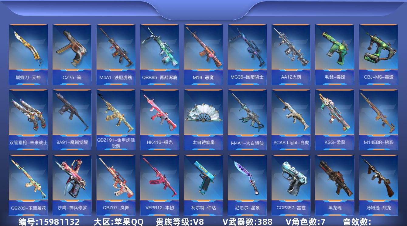 [15981132]10英雄角色数-378英雄武器数 【王者系列】:王者之影,王者之魄,王者之心,王者之神,王者之锋,王者之迹,王者之蝶,王者之兽,王者之狱,王者之魂,王者幻神,王者之烈*2,王者之霆,王者之业,王者之誉,M4A1-雷霆王者,巴雷特-雷霆王者,M12S-雷霆王者,王者之尊 【热门武器】:KSG-孟获,CZS2-仲康,COP 357-安琪拉*2,AN94-盖,81式-光明之神,MK47-仁德,M4A1-七色宝葫,AK47-孟德,M4A1-仲达,AK47-奉先,M4A1-星象,M4A1-游骑兵,TAC-慈,VEPR12-本初,黑龙魂,81式-阿波罗,COP 357-雷霆*2 【角色】:葵,幽灵刀锋-觉醒,关小雨*2,晴雅,月神-X,甄梦,步练师*2 【英雄武器】:AK47-无影,AK47-火麒麟,AK47-机械迷城,AK47-孟德,AK47-猩红传说,AK47-燎天净火,AK47-奉先,AK47-黑鲨,AK47-木兰,AK47-谜城烟火*2,M4A1-雷神*2,M4A1-黑骑士*2,M4A1-死神,M4A1-游骑兵,M4A1-星象,M4A1-仲达,M4A1-竞界荣光,M4A1-七色宝葫,M4A1-机械迷城,M4A1-赛博雷神,M4A1-海骑士,M4A1-运输船*3,M4A1-猎神,M4A1-雷暴,M4A1-雷霆王者,M4A1-太白诗仙,M4A1-铁胆虎魄,SCAR-幽暗骑士*2,SCAR-幽暗骑士觉醒,SCAR Light-白虎,SCAR-探星者,SCAR-心动PICK,AN94-卷帘大将军,AN94-四凶觉醒,AN94-精卫填海,AN94-盖,AUG-机械纪元,FAMAS-湮灭,9A91-游骑兵,9A91-魔蜥觉醒,M14EBR-暗夜觉醒,M14EBR-天神,M14EBR-拂影,M14EBR-玄武,M14EBR-葫芦山庄,M16-恶魔,AK12-天启,QBZ03-金色蔷薇*2,QBZ03-死神,QBZ03-玉面羞花,HK416-极光,HK417-炎龙铠甲,81式-光明之神,QBZ19-天使*2,G36-李星云,MK47-云舞,MK47-仁德,G3A3-衍神兵*2,FN F2000-十绝阵觉醒,QBZ97-岚舞,QBZ97-浩瀚征途,QBZ191-金甲虎啸觉醒,QBZ191-封神榜,AWM-天龙,AWM-裁决,AWM-大湾溢彩,巴雷特-毁灭*6,巴雷特-极光*6,巴雷特-
