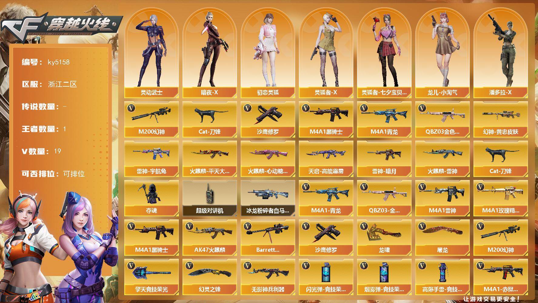 [16005911]浙江二区-19V-1王者-0炫金 【热门武器】:QBZ03-金色蔷薇,M4A1-青龙,M200-幻神,Cat-刀锋,M4A1-黑骑士,沙鹰-修罗 【皮肤】:M200-幻神-黄忠皮肤,雷神-暗月,雷神-宇航兔皮肤,火麒麟-雷神,火麒麟-平天大圣,火麒麟-心动糖果,天启-高能霹雳 皮肤 【角色】:暗夜-X,初恋灵狐,灵动武士,灵狐者-X,灵狐者-七夕宝贝,龙儿-小淘气,潘多拉-X,斯沃特-X 【人偶武器】:Cat-刀锋,夺魂 【暴走生化】:超级对讲机 【挑战大师】:冰龙粉碎者-白马银枪 【英雄级武器】:AK47-火麒麟*2,M4A1-雷神,M4A1-黑骑士,M4A1-青龙,无影-神兵利器,M4A1-玫瑰精灵,QBZ03-金色蔷薇,Barrett-毁灭,M200-幻神,沙鹰-修罗,屠龙,龙啸,幻灵之锋,擎天-竞技荣光,高爆手雷-竞技荣光,闪光弹-竞技荣光,闪光弹-雷霆王者-觉醒版,烟雾弹-竞技荣光,M4A1-赤狱骑士 【道具】:CFS限定背包,老虎背包,救世主-黑桃战神,绿色巨人,灵魂忍者,迷雾幽灵,夺命之镰,防化服*2,枪王排位28赛季金色流光,枪王排位29赛季金色流光,防弹头盔*2,防弹衣*2,C4工具钳*2,手雷包*2 【特殊枪械】:1黑骑士