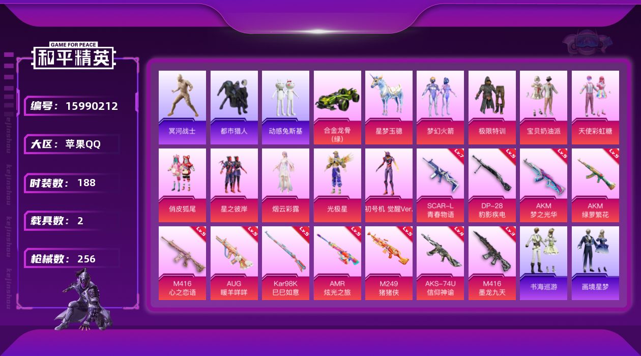 - PX_2093517- 苹果手Q-16王牌印记-6粉装-7特效枪-3载具-85721热力值-167套装-263枪皮-3卓越印记-0传奇印记 【6粉装】,梦幻火箭,幻彩电音,玩偶服-猪猪侠,碧影闪光,萨利娅,音爆索尼克 【7特效枪】AKM-炫紫旋律-6级 M416-风花雪月-7级 Kar98K-巳巳如意-5级 Mk14-精灵梦叶罗丽-7级 P90-沙丘之主-3级 M249-蓝莓炮弹-7级 破片手榴弹