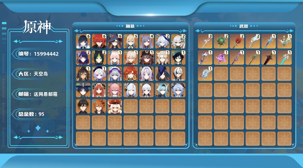 0命克洛琳德,0命阿蕾奇诺,2命芙宁娜,1命迪希雅,0命流浪者,2命纳西妲,0命妮露,2命提纳里,满命夜兰,0命八重神子,0命申鹤,0命优菈,2命雷电将军,1命枫原万叶,0命神里绫华,0命钟离,1命胡桃,0命甘雨,1命温迪,0命可莉,0命达达利亚,1命阿贝多,1命珊瑚宫心海,4命刻晴,1命七七,5命琴,满命莫娜,满命迪卢克,0命玛薇卡,0命茜特菈莉,0命梦见月瑞希,0命丝柯克,精1静水流涌之辉,精2碧落之珑,精1千夜浮梦,精1若水,精1神乐之真意,精1薙草之稻光,精2护摩之杖,精1四风原典,精1和璞鸢,精2天空之翼,精1天空之刃,精3风鹰剑,精1狼的末路,精1苍耀