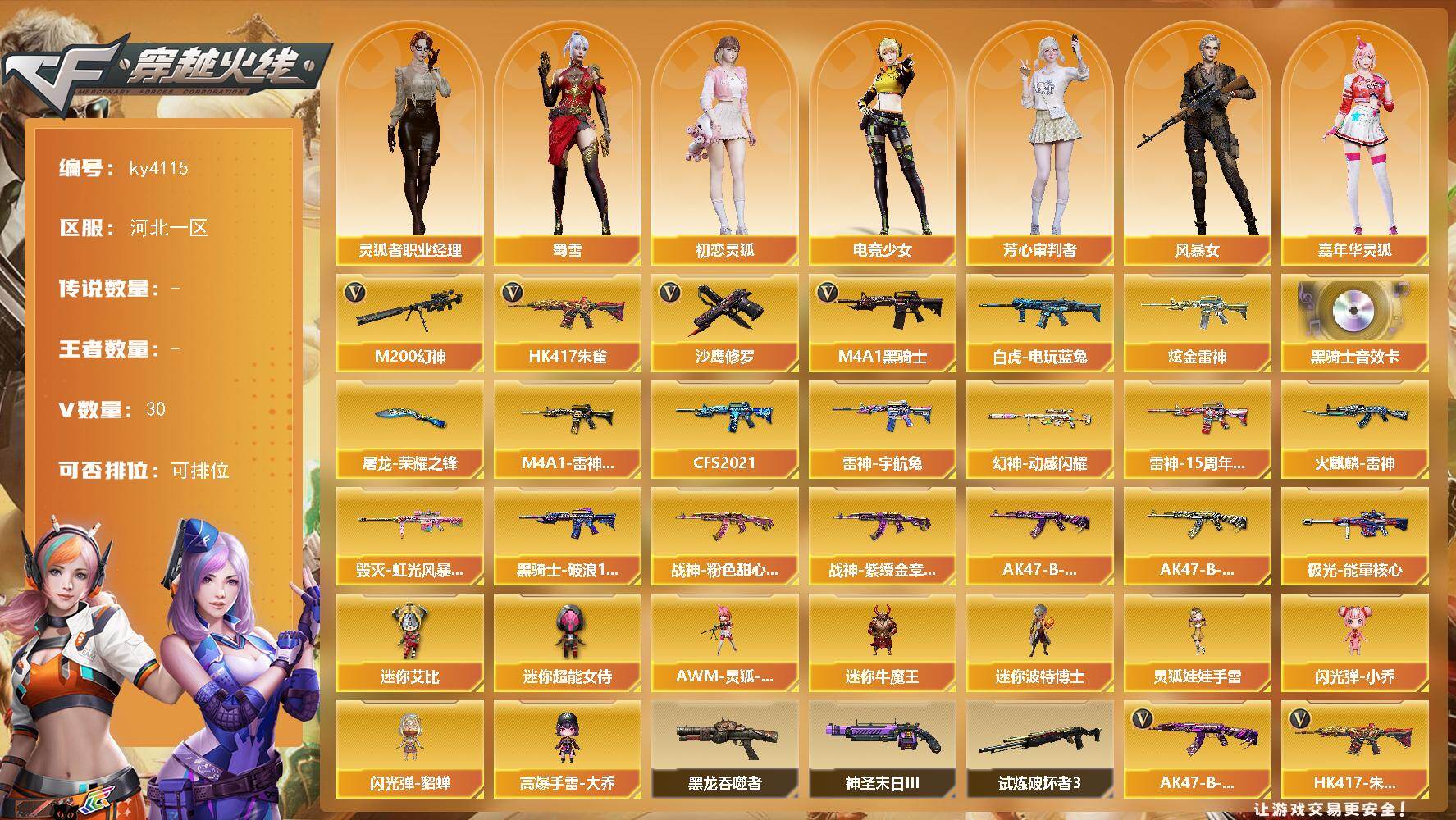[16020662]河北一区-30V-0王者-1炫金 【热门武器】:HK417-朱雀,M200-幻神,白虎-电玩蓝兔,M4A1-黑骑士,沙鹰-修罗*2 【王者炫金武器】:炫金雷神 【音效卡】:M4A1-黑骑士音效卡 【皮肤】:幻神-动感闪耀 皮肤,M4A1-雷神-CFS 2019,雷神-宇航兔皮肤,雷神-15周年嘉年华 皮肤,火麒麟-雷神,毁灭-虹光风暴 皮肤,黑骑士-CFS2021,黑骑士-破浪10年皮肤,战神-粉色甜心皮肤,战神-紫绶金章皮肤*2,AK47-B-常胜将军-曹操*2,AK47-B-常胜将军-刘备,极光-能量核心,屠龙-荣耀之锋 【角色】:初恋灵狐,电竞少女,芳心审判者,风暴女,嘉年华灵狐,灵狐者-职业经理,龙儿,潘多拉-X,潘多拉-甜心教官,斯沃特-X,蜀雪,兔囡囡,夜玫瑰-幻能朋克 【人偶武器】:AWM-灵狐-15周年嘉年华,迷你牛魔王,迷你波特博士,闪光弹-小乔,闪光弹-貂蝉,高爆手雷-大乔,迷你艾比,迷你超能女侍,灵狐娃娃手雷 【暴走生化】:黑龙吞噬者 【挑战大师】:试炼破坏者III,神圣爆裂者-末日III 【英雄级武器】:AK47-火麒麟,M4A1-雷神,M4A1-黑骑士,HK417-朱雀,无影-神兵利器,黑武士-锦绣游龙,AK-47-猩红传说*5,AK47-B-常胜将军*2,白虎-电玩蓝兔,Barrett-毁灭,M200-幻神,沙鹰-修罗*2,沙鹰-天神,屠龙,烟雾弹-竞技荣光,M4A1-赤狱骑士 【道具】:亚洲杯纪念炫彩背包,全能枪王背包,虎牙炫彩背包,超级背包,黄金曼提柯尔的背包,女皇终结者-魔龙之吻,绿色巨人,灵魂忍者,迷雾幽灵,夺命之镰,防化服*2,金色流光-枪王排位*2,星辰流光-枪王排位,枪王排位29赛季金色流光,语音特效-生化,电玩兔兔表情,EP战队名片,防弹头盔*2,防弹衣*2,C4工具钳*2,手雷包*2 【特殊枪械】:1黑骑士
