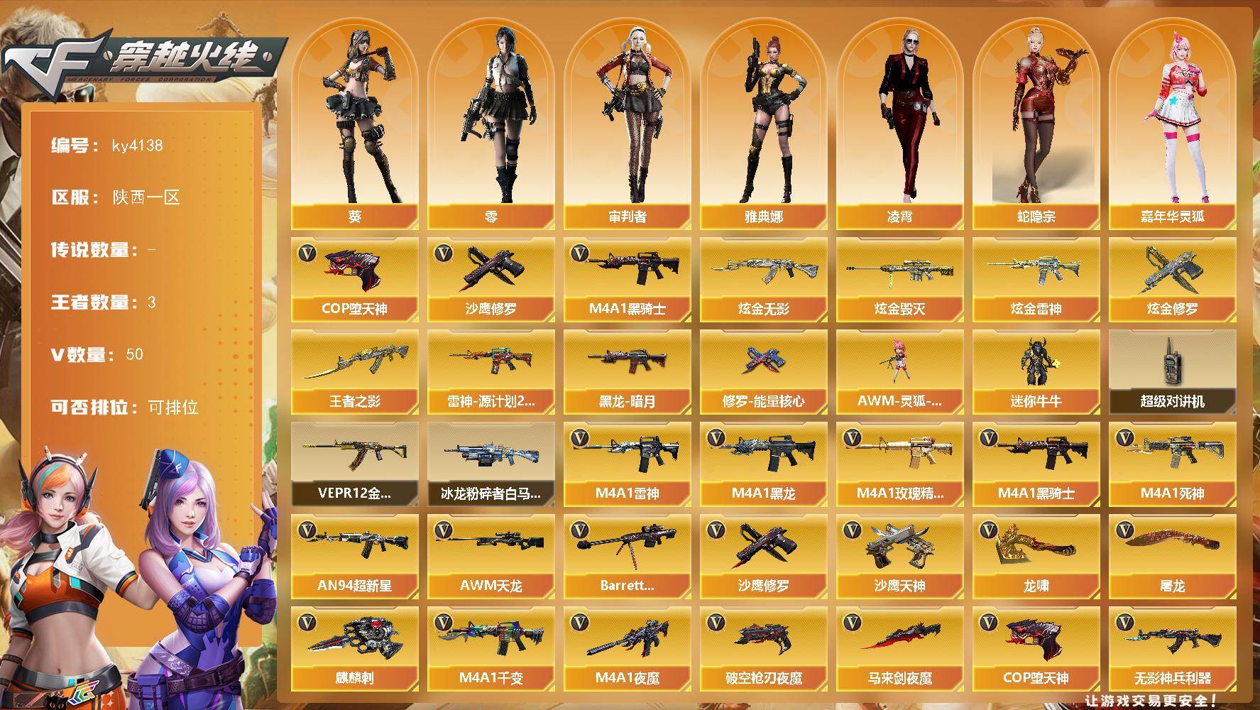 [16021442]陕西一区-50V-3王者-4炫金 【热门武器】:M4A1-黑骑士,COP-堕天神*3,沙鹰-修罗 【王者炫金武器】:王者之影,炫金无影,炫金雷神,炫金毁灭,炫金修罗 【皮肤】:雷神-源计划2.0专属 皮肤,黑龙-暗月,修罗-能量核心 【角色】:零,葵,凌霄,审判者,蛇隐宗,嘉年华灵狐,灵狐-花神,灵狐者-X,曼陀罗-X,潘多拉-X,蛇姬,兔囡囡,雅典娜 【人偶武器】:AWM-灵狐-15周年嘉年华,迷你牛牛 【暴走生化】:超级对讲机 【挑战大师】:冰龙粉碎者-白马银枪,VEPR-12-金魔*3 【英雄级武器】:M4A1-千变,M4A1-黑龙,M4A1-雷神,M4A1-黑骑士,M4A1-死神,AN94-超新星,M4A1-夜魔,无影-神兵利器,M4A1-玫瑰精灵,王者之武-觉醒版,AWM-天龙,Barrett-毁灭,沙鹰-修罗,沙鹰-天神,COP-堕天神*3,破空枪刃-夜魔,屠龙,龙啸,马来剑-夜魔,麒麟刺,高爆手雷-雷霆,高爆手雷-夜魔*7,闪光弹-雷霆,闪光弹-夜魔*7,烟雾弹-雷霆,烟雾弹-夜魔*7,烟雾弹-古蛇迷踪 【道具】:超级背包,黄金超能特工背包,变异宝贝,夺命之镰,防化服,金色流光-枪王排位,星辰流光-枪王排位,枪王排位29赛季金色流光,防弹头盔*2,防弹衣*2,C4工具钳*2,手雷包*2 【特殊枪械】:1黑骑士