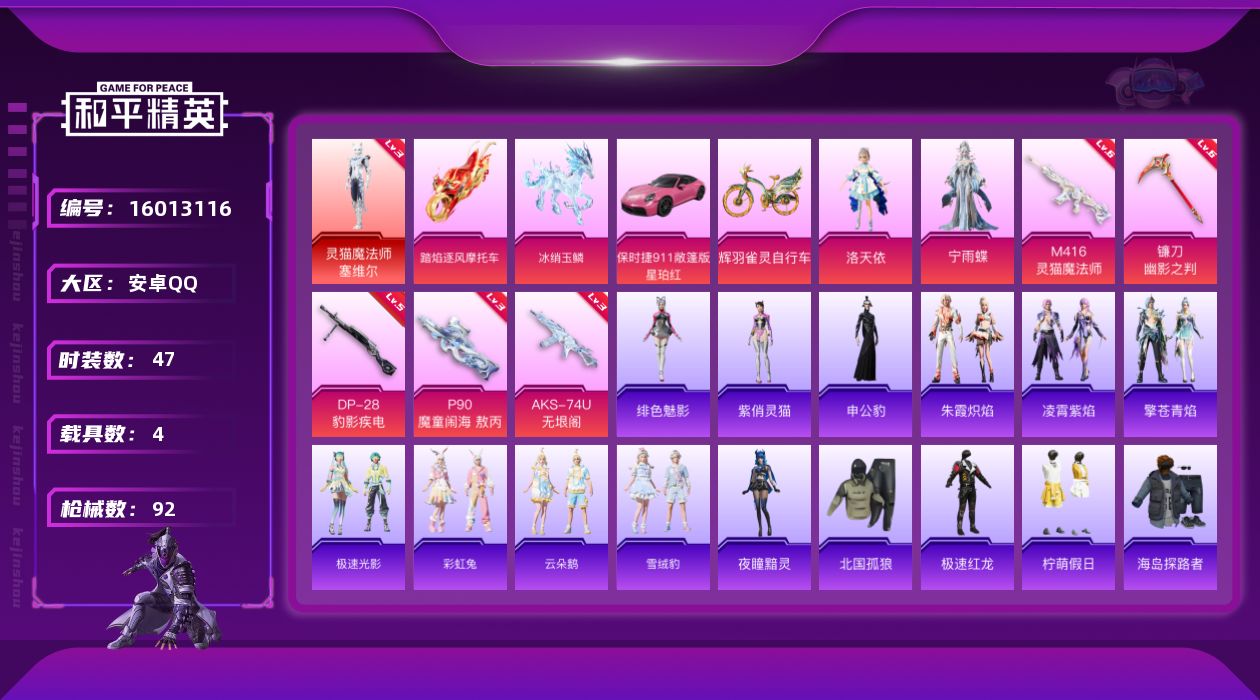 [16013116]【特价出售/店主推荐】安卓 手Q-1神装-2粉装-5特效枪-4载具-6粉色飞行器-34466热力值-4王牌印记-47套装-92枪皮【红色神装等级】:灵猫魔法师-塞维尔(三级)【红色角色神装】:灵猫魔法师-塞维尔【粉色套装】:角色-洛天依,角色-宁雨蝶【粉色枪皮等级】:M416-灵猫魔法师(六级),AKS-74U-无垠阁(三级),P90-魔童闹海 敖丙(三级),DP-28-豹影疾电(五级),镰刀-幽影之判(六级)【粉色载具】:保时捷911 敞篷版(星珀红),踏焰逐风摩托车,冰绡玉鳞,辉羽雀灵自行车【粉色枪皮】:M416-灵猫魔法师,AKS-74U-无垠阁,P90-魔童闹海 敖丙,DP-28-豹影疾电,镰刀-幽影之判【粉色飞行器】:雀灵庇佑飞行器,灵猫魔法师飞行器,飞天猪飞行器,灵珠游龙飞行器