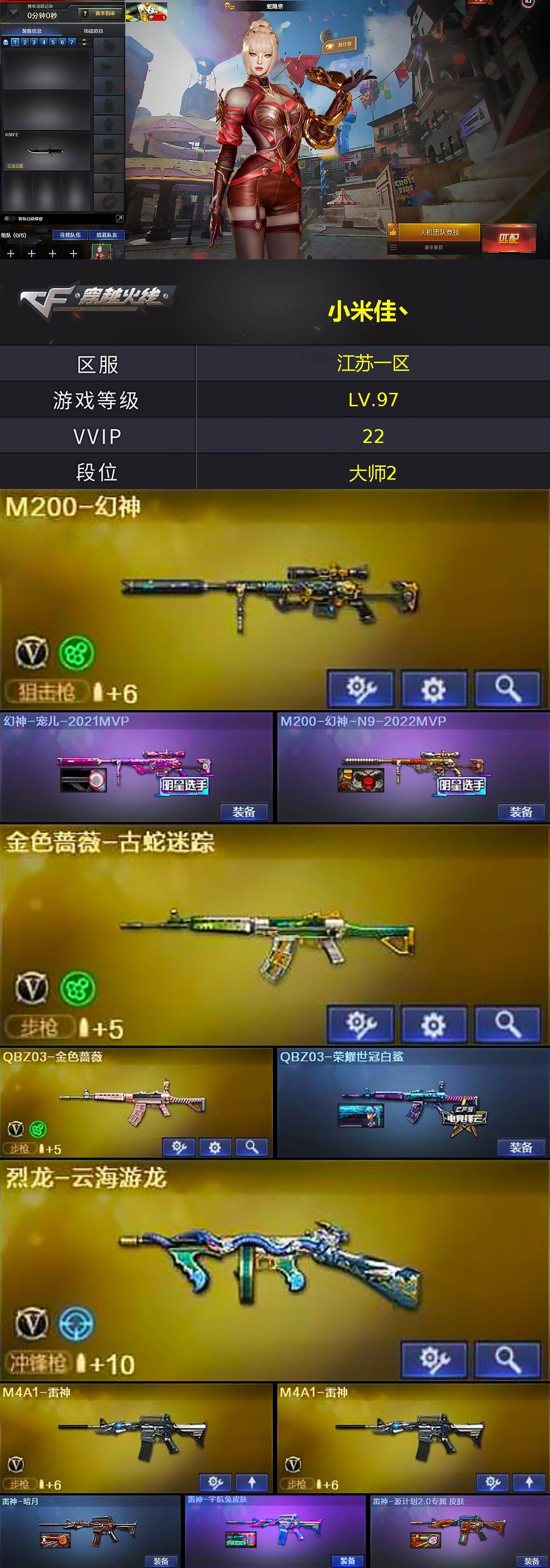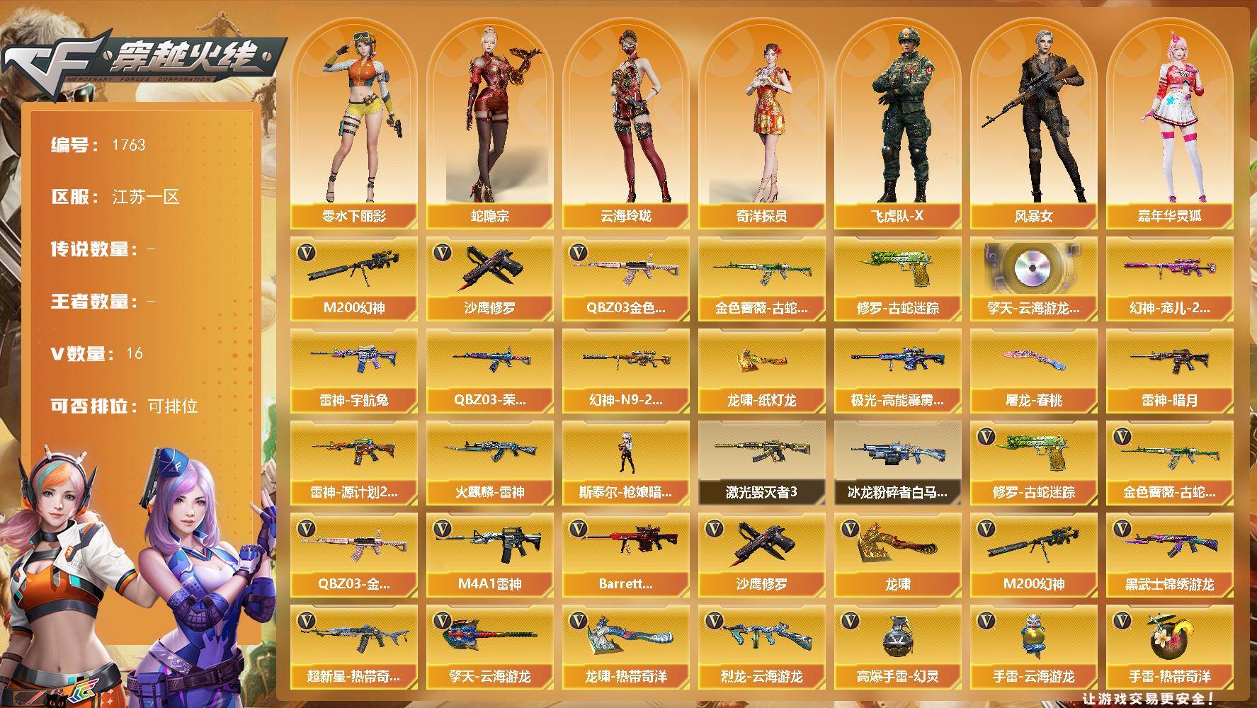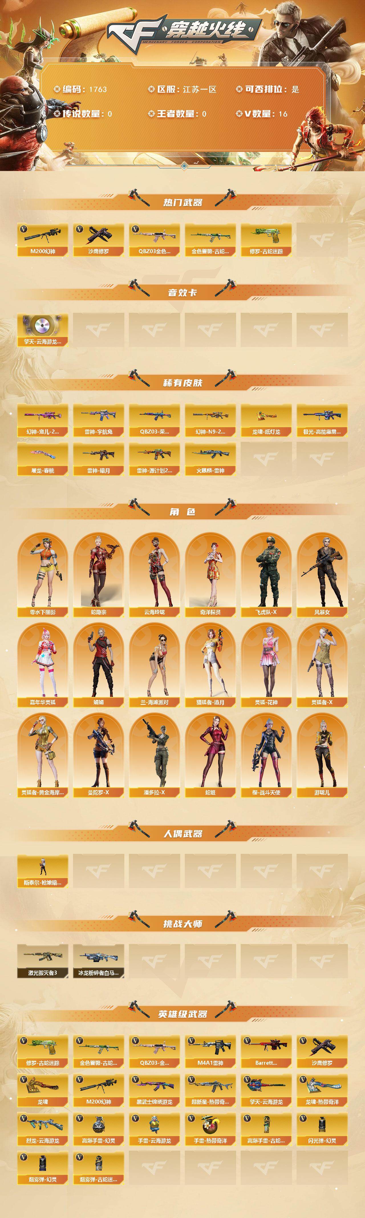 [16020966]江苏一区-16V-0王者-0炫金 【热门武器】:QBZ03-金色蔷薇,M200-幻神,金色蔷薇-古蛇迷踪,修罗-古蛇迷踪,沙鹰-修罗*2 【音效卡】:擎天-云海游龙音效卡 【皮肤】:幻神-宠儿-2021MVP,M200-幻神-N9-2022MVP,QBZ03-荣耀世冠白鲨,雷神-暗月,雷神-宇航兔皮肤,雷神-源计划2.0专属 皮肤,火麒麟-雷神,极光-高能霹雳 皮肤,屠龙-春桃 皮肤,龙啸-纸灯龙皮肤 【角色】:蛇隐宗,奇洋探员,云海玲珑,飞虎队-X,风暴女,嘉年华灵狐,娟娟,兰-海滩派对,猎狐者-追月,零-水下丽影,灵狐-花神,灵狐者-X,灵狐者-黄金海岸,曼陀罗-X,潘多拉-X,蛇姬,樱-战斗天使,游珑儿 【人偶武器】:斯泰尔-枪娘暗刃 【挑战大师】:冰龙粉碎者-白马银枪,激光毁灭者III 【英雄级武器】:M4A1-雷神*2,黑武士-锦绣游龙,超新星-热带奇洋,金色蔷薇-古蛇迷踪,QBZ03-金色蔷薇,Barrett-极光,M200-幻神,烈龙-云海游龙,沙鹰-修罗*2,修罗-古蛇迷踪,龙啸,擎天-云海游龙,龙啸-热带奇洋,高爆手雷-幻灵,手雷-云海游龙,手雷-热带奇洋,高爆手雷-古蛇迷踪,闪光弹-幻灵,烟雾弹-幻灵,烟雾弹-古蛇迷踪 【道具】:云海游龙炫彩背包,古蛇迷踪炫彩背包,奇洋探员-海龟背包,热带奇洋炫彩背包,超级背包,绿色巨人,灵魂忍者,变异宝贝,迷雾幽灵,生化弹匣,夺命之镰,防化服,金色流光-枪王排位*2,星辰流光-枪王排位,巅峰赛先锋-金色流光,枪王排位28赛季金色流光,枪王排位29赛季金色流光,古蛇迷踪打击特效,蛇隐宗表情,热带奇洋表情,云海游龙表情,防弹头盔,防弹衣,C4工具钳,手雷包 【特殊枪械】: