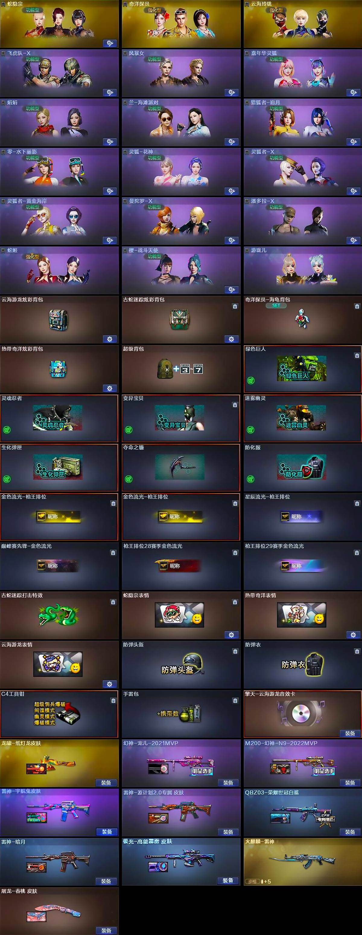 【道具】:云海游龙炫彩背包,古蛇迷踪炫彩背包,奇洋探员-海龟背包,热带奇洋炫彩背包,超级背包,绿色巨人,灵魂忍者,变异宝贝,迷雾幽灵,生化弹匣,夺命之镰,防化服,金色流光-枪王排位*2,星辰流光-枪王排位,巅峰赛先锋-金色流光,枪王排位28赛季金色流光,枪王排位29赛季金色流光,古蛇迷踪打击特效,蛇隐宗表情,热带奇洋表情,云海游龙表情,防弹头盔,防弹衣,C4工具钳,手雷包