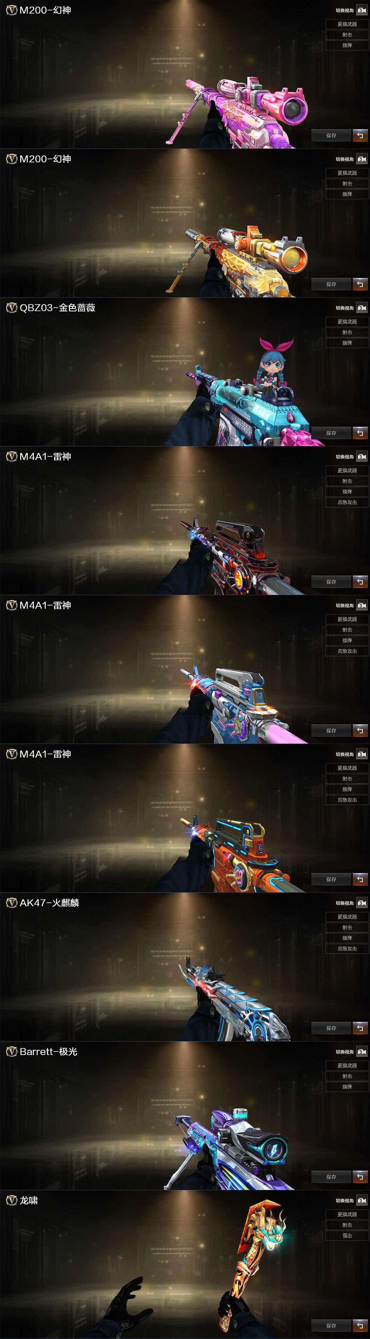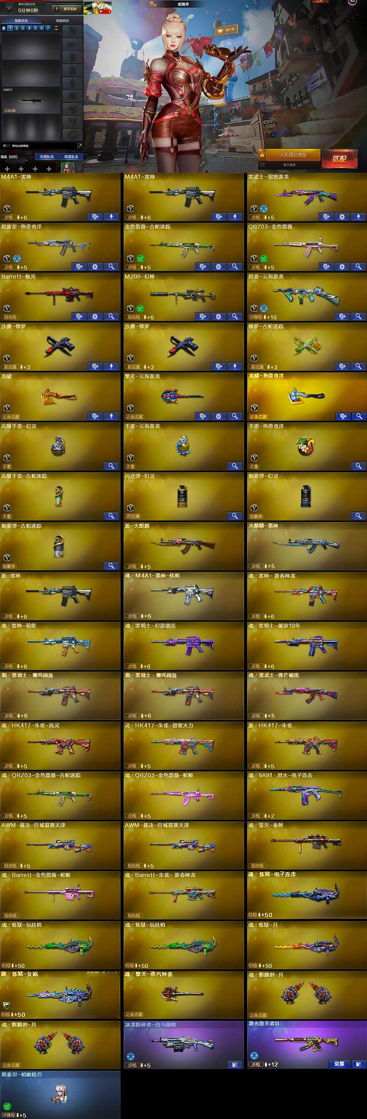 【英雄级武器】:M4A1-雷神*2,黑武士-锦绣游龙,超新星-热带奇洋,金色蔷薇-古蛇迷踪,QBZ03-金色蔷薇,Barrett-极光,M200-幻神,烈龙-云海游龙,沙鹰-修罗*2,修罗-古蛇迷踪,龙啸,擎天-云海游龙,龙啸-热带奇洋,高爆手雷-幻灵,手雷-云海游龙,手雷-热带奇洋,高爆手雷-古蛇迷踪,闪光弹-幻灵,烟雾弹-幻灵,烟雾弹-古蛇迷踪
