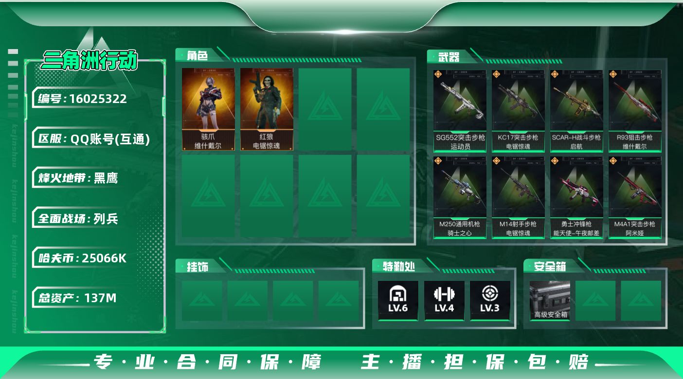 [16025322]【店主推荐捡漏号!可直接换绑】 25066k哈伏币-129m流动资产-60烽火等级-黑鹰-11战场等级-列兵 【干员外观】:骇爪-维什戴尔,红狼-电锯惊魂 【近战皮肤】:近战-黑鹰 【传说级普通外观】:M4A1突击步枪-蚀金玫瑰,M4A1突击步枪-阿米娅,SG552突击步枪-运动员,SCAR-H战斗步枪-启航,CAR-15突击步枪-阿米娅,KC17突击步枪-电锯惊魂,勇士冲锋枪-能天使-午夜邮差,M250通用机枪-骑士之心,M14射手步枪-电锯惊魂,R93狙击步枪-维什戴尔 【史诗级普通外观】:ASh-12战斗步枪-无极限,G3战斗步枪-流沙送葬,AS Val突击步枪-百步穿杨,腾龙突击步枪-猎鳄行动,K437突击步枪-守护者,MP5冲锋枪-战术竞备,MP5冲锋枪-竞技风,Vector冲锋枪-猎鳄行动,勇士冲锋枪-深海恐惧,勇士冲锋枪-工业狂潮,MP7冲锋枪-守护者,PKM通用机枪-蝮蛇,Mini-14射手步枪-守护者,SVD狙击步枪-阿萨拉工艺,SV-98狙击步枪-猎鳄行动,M700狙击步枪-竞技风,M700狙击步枪-百步穿杨,AWM狙击步枪-无极限,复合弓-守护者 【稀有级普通外观】:As Val突击步枪-星之彩,PTR-32突击步枪-黑潮,AKM突击步枪-战术演练,AKM突击步枪-肃杀,QBZ95-1突击步枪-公平竞技,ASh-12战斗步枪-繁盛,M7战斗步枪-前沿科技,M7战斗步枪-捣蛋鬼,SCAR-H战斗步枪-荣耀列队,SCAR-H战斗步枪-黄昏,G3战斗步枪-战术演练,G3战斗步枪-主宰,腾龙突击步枪-冰天雪地,MP5冲锋枪-弄臣,MP5冲锋枪-哈夫克卫队,P90冲锋枪-黄昏,P90冲锋枪-捣蛋鬼,Vector冲锋枪-先锋,UZI冲锋枪-亚特兰蒂斯,SMG-45-行动开启,SMG-45冲锋枪-幻影结构,勇士冲锋枪-主宰,勇士冲锋枪-冰天雪地,M1014霰弹枪-幻影结构,S12K霰弹枪-战术演练,QJB201轻机枪-黄昏,QJB201轻机枪-哈夫克卫队,Mini-14射手步枪-荣耀列队,SKS射手步枪-弄臣,SR-25射手步枪-开拓,SR-25射手步枪-前沿科技,SV-98狙击步枪-星链科技,SV-98狙击步枪-哈夫克航天,SV-98狙击步枪-精英联盟,G18-星链科技,G18-哈夫克航天 【普通级普通外观】:M14射手步枪-蛇纹涂装,AS Val突击步