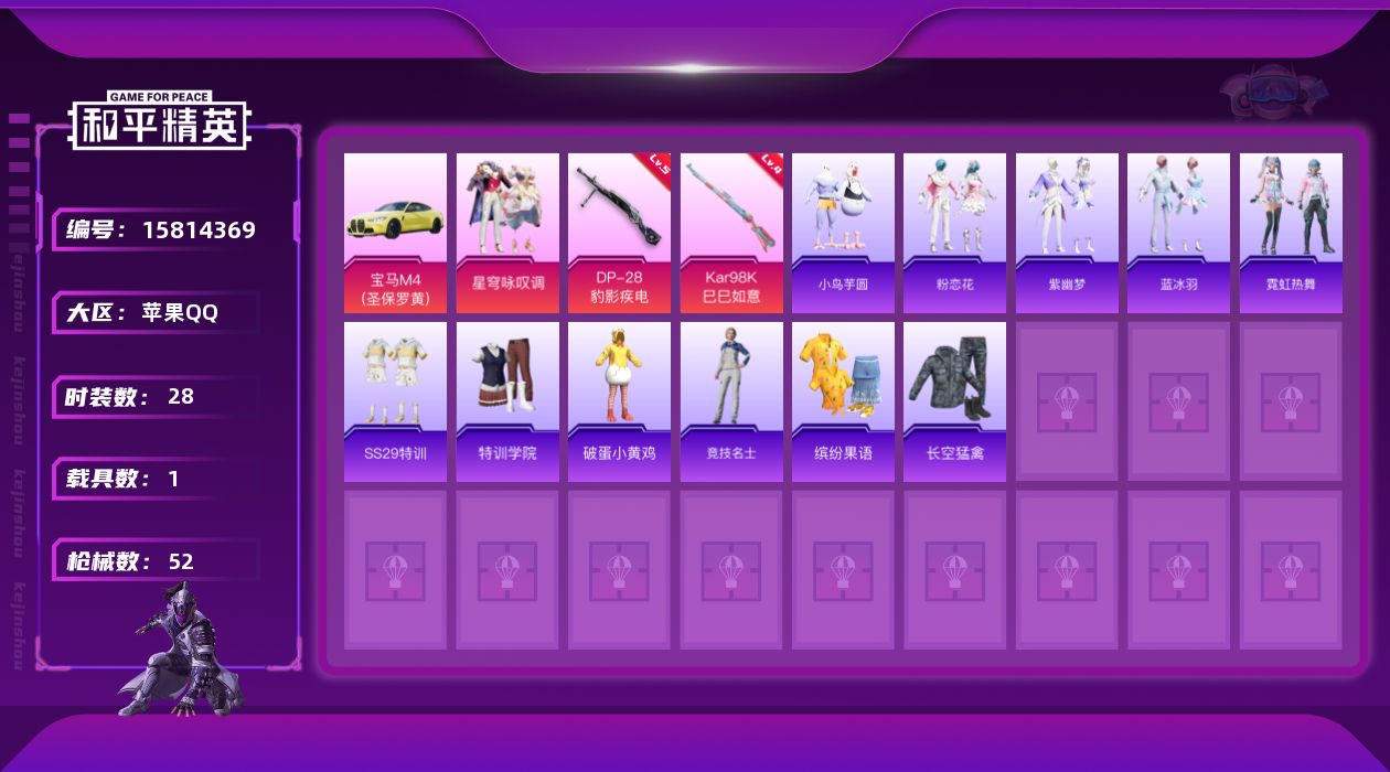 [15814369]【特价出售/店主推荐】苹果 手Q-1粉装-2特效枪-1载具-1.3w热力值-3王牌印记-28套装-52枪皮 【粉色套装】:粉装-星穹咏叹调 【粉色枪皮等级】:Kar98K-巳巳如意(四级),DP-28-豹影疾电(五级) 【粉色载具】:宝马M4(圣保罗黄) 【粉色枪皮】:Kar98K-巳巳如意,DP-28-豹影疾电 【粉色降落伞】:智耀战神降落伞 【稀有套装】:套装-小鸟芋圆,套装-粉恋花,套装-紫幽梦,套装-蓝冰羽,套装-霓虹热舞 【稀有枪皮】:SCAR-L-炫彩节奏,M416-蓝色火焰,AUG-耀粉歌者,M762-天降萌叽,G36C-星穹咏叹调,UZI-啾咪啾咪,AMR-喜羊羊与灰太狼,S1897-炫彩节奏,S12K-智耀战神,DBS-彩虹符号,MG3-幻世战舞者,短管霰弹-星穹咏叹调,爆炸猎弓-喜羊羊与灰太狼 【其他套装】:套装-SS29特训,套装-特训学院,套装-破蛋小黄鸡,套装-竞技名士,套装-缤纷果语,套装-长空猛禽 【营地ID】:764063097