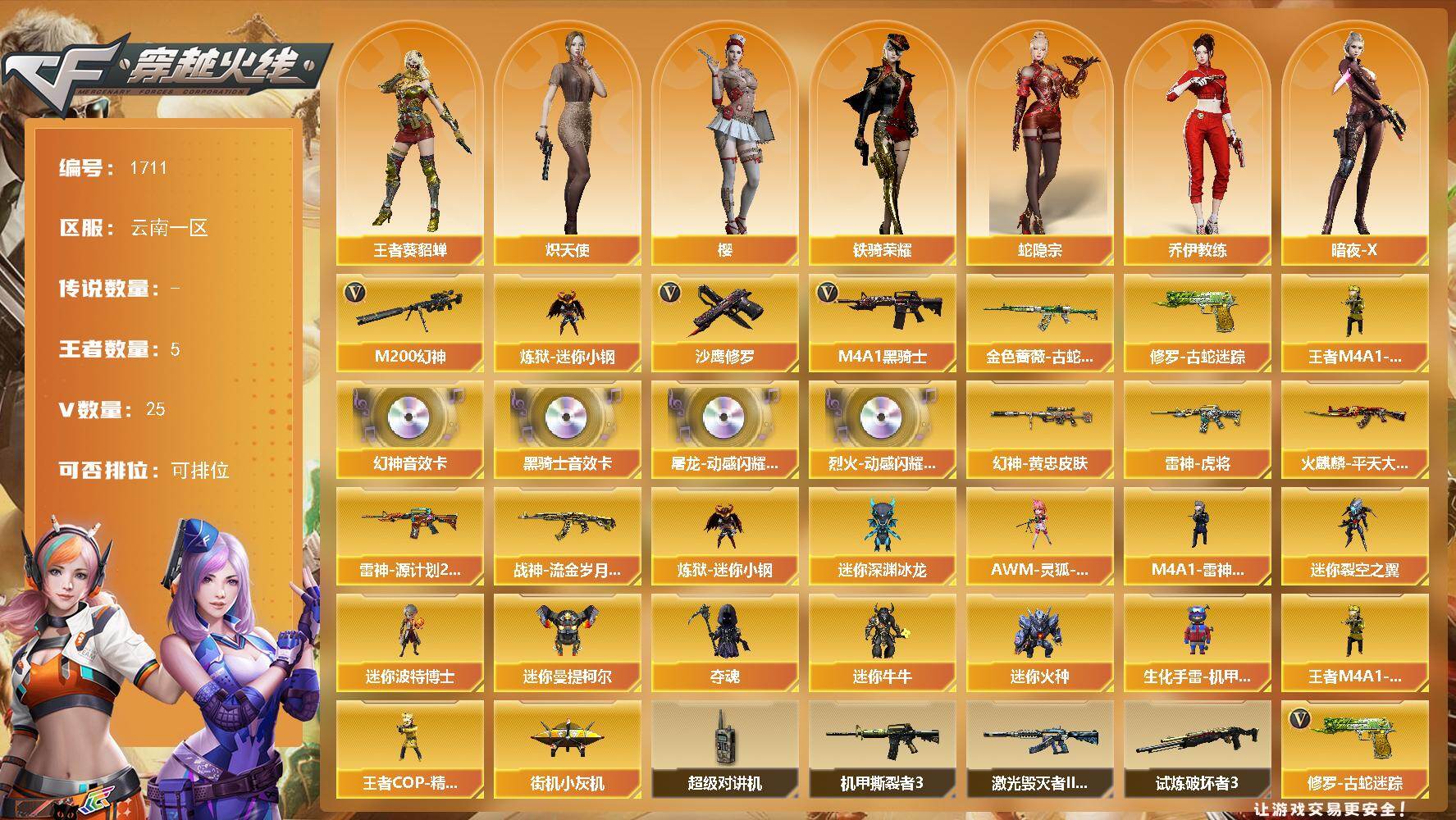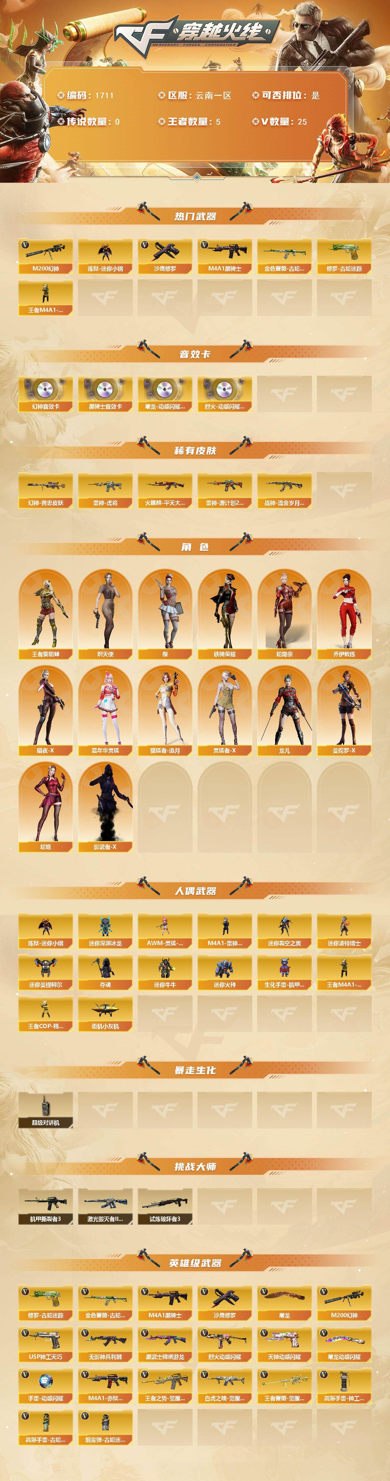 [15886459]云南一区-25V-5王者-0炫金 【热门武器】:M200-幻神,金色蔷薇-古蛇迷踪,修罗-古蛇迷踪,炼狱-迷你小钢,M4A1-黑骑士*5,王者M4A1-萌萌金发刀锋,沙鹰-修罗*5 【音效卡】:屠龙-动感闪耀 音效卡,烈火-动感闪耀 音效卡,M200-幻神音效卡,M4A1-黑骑士音效卡 【皮肤】:M200-幻神-黄忠皮肤,雷神-虎将,雷神-源计划2.0专属 皮肤,火麒麟-平天大圣*2,战神-流金岁月皮肤 【角色】:樱,王者-葵-貂蝉,蛇隐宗,乔伊教练,炽天使,暗夜-X,嘉年华灵狐,猎狐者-追月,灵狐者-X,龙儿,曼陀罗-X,蛇姬,铁骑荣耀,影武者-X 【人偶武器】:王者M4A1-萌萌金发刀锋,M4A1-雷神-精英刀锋,炼狱-迷你小钢,王者COP-精英刀锋,街机小灰机,AWM-灵狐-15周年嘉年华,迷你深渊冰龙,迷你裂空之翼*2,迷你波特博士*7,迷你曼提柯尔,夺魂*3,迷你牛牛,迷你火种*7,生化手雷-机甲核心 【暴走生化】:超级对讲机 【挑战大师】:激光毁灭者III-白马银枪,机甲撕裂者III,试炼破坏者III 【英雄级武器】:M4A1-黑骑士*5,无影-神兵利器,黑武士-锦绣游龙,金色蔷薇-古蛇迷踪,烈火-动感闪耀,王者之势-觉醒版,白虎之魄-觉醒版,M200-幻神,王者蔷薇-觉醒版,沙鹰-修罗*5,USP-神工天巧,天神-动感闪耀,修罗-古蛇迷踪,屠龙,屠龙-动感闪耀,高爆手雷-神工天巧*2,手雷-动感闪耀,高爆手雷-古蛇迷踪,烟雾弹-古蛇迷踪,M4A1-赤狱骑士 【道具】:BS战队炫彩背包,QQ会员专属背包,古蛇迷踪炫彩背包,战舰背包,背包-洛丽塔,超级背包,黄金超能特工背包,救世主-黑桃战神,黄金生化钩,绿色巨人,灵魂忍者,迷雾幽灵,夺命之镰,防化服*3,金色流光-枪王排位*2,星辰流光-枪王排位,枪王排位28赛季金色流光,枪王排位29赛季金色流光,古蛇迷踪打击特效,蛇隐宗表情,动感闪耀表情,防弹头盔*3,防弹衣*3,C4工具钳*3,手雷包*3 【特殊枪械】:5黑骑士