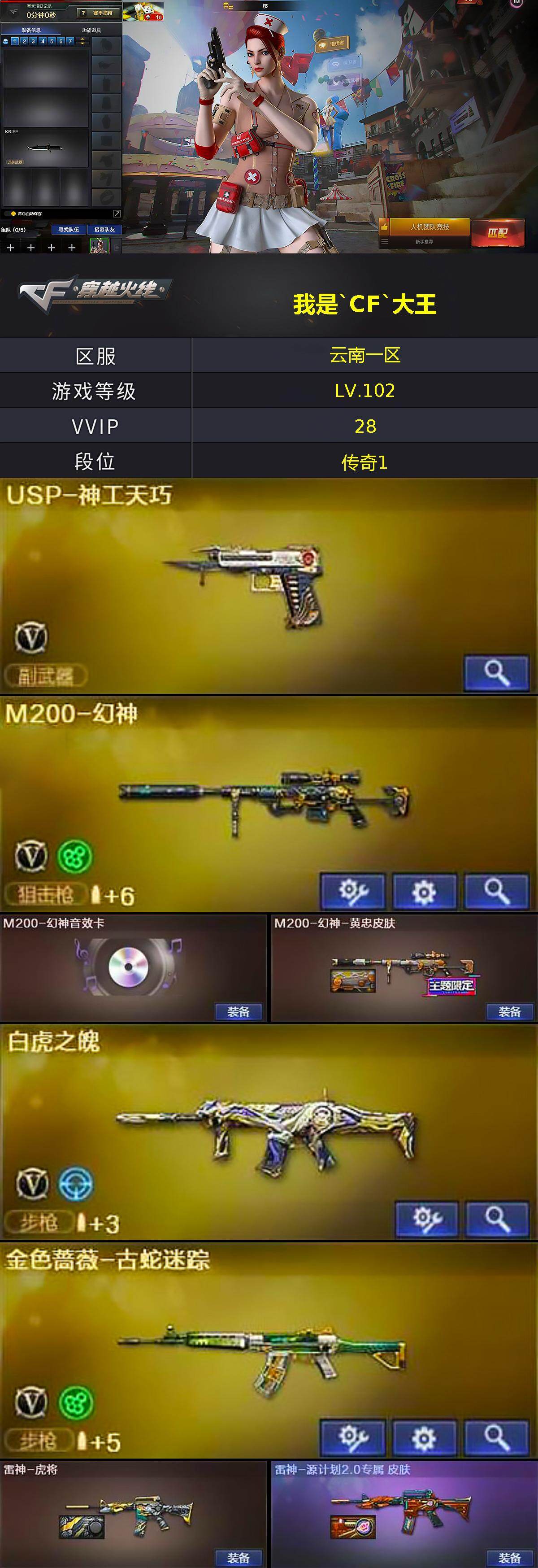 【热门武器】:M200-幻神,金色蔷薇-古蛇迷踪,修罗-古蛇迷踪,炼狱-迷你小钢,M4A1-黑骑士*5,王者M4A1-萌萌金发刀锋,沙鹰-修罗*5