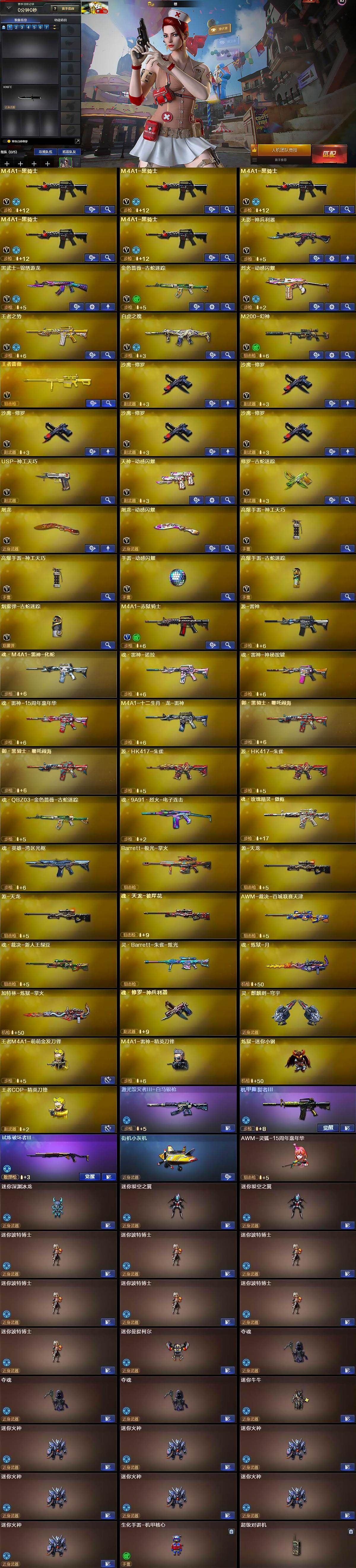 【人偶武器】:王者M4A1-萌萌金发刀锋,M4A1-雷神-精英刀锋,炼狱-迷你小钢,王者COP-精英刀锋,街机小灰机,AWM-灵狐-15周年嘉年华,迷你深渊冰龙,迷你裂空之翼*2,迷你波特博士*7,迷你曼提柯尔,夺魂*3,迷你牛牛,迷你火种*7,生化手雷-机甲核心