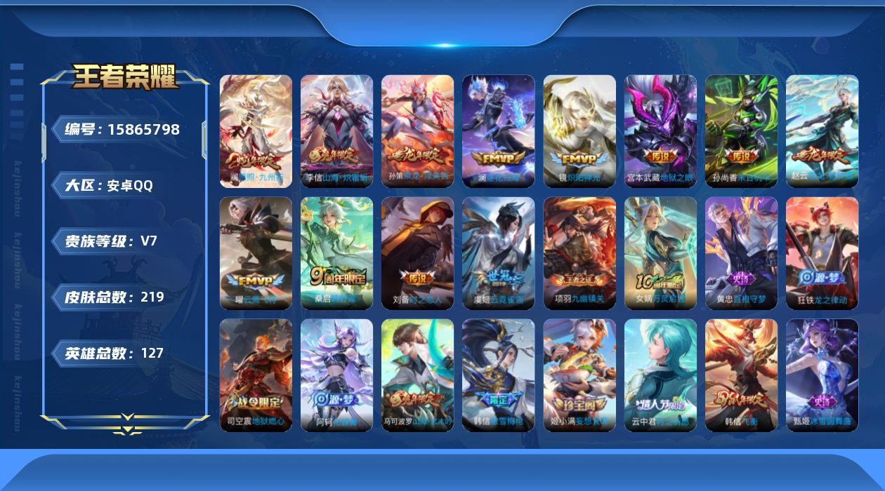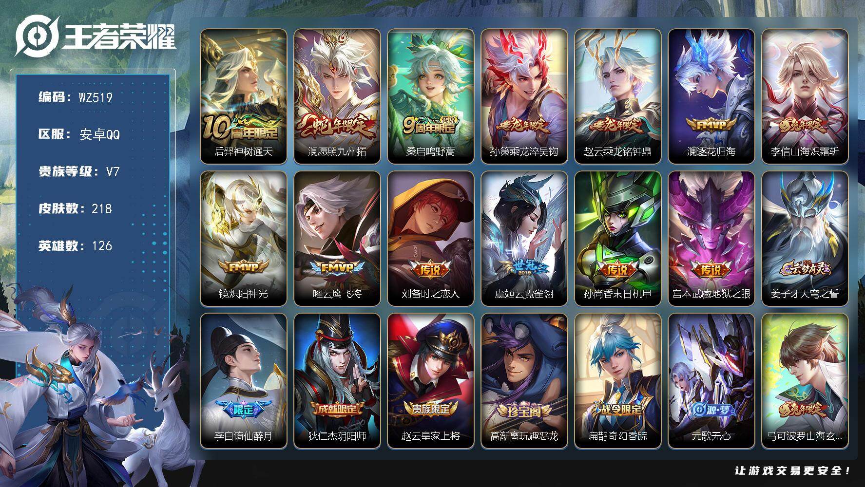 - [11530323]V7 1典藏 2珍品传说 9传说 124英雄 269皮肤 可修改实名 优质装备:鸣剑·曳影,大耳狗之梦,云鹰飞将(小将军),一念神魔,音你闪耀(rap皮),惊梅引,玄雷天君 珍品传说:时之奇旅-孙策 传说皮:幻光神枪 珍宝阁皮:优雅恋人,蔷薇恋人 限定皮:愿照·岁时盈(虞姬年限),逐霄战戟,鸣野蒿,夏侯惇霜北刀,梁祝,天狼溯光者,李小龙,逐梦之影,大圣娶亲 史诗皮:鸭鸭历险记-刘禅,器灵·浮梦炉,化蝶舞,星界战将,龙之律动,石田雨龙,茶境仙,撼地雄心,破空之剑,蒙犽顽岩魄,百相守梦-百里守约,百相守梦-黄忠,紫霞仙子,黄金分割率,特工魅影,千年之狐,银翎春语,蒙恬荣光圣徽,偶像歌手,白蛇,魅语,晚萤,青蛇,末日机甲-吕布,猫狗日记-孙策,猫狗日记-大乔,时之恋人-孙尚香,乱世虎臣,节奏热浪,修罗,女仆咖啡,摇滚巨星,水果甜心,绅士熊喵,天才门将,星夜王子,功夫厨神,暗隐猎兽者,幽灵船长,鬼剑武藏,乐园奇幻夜,天秀·启明,舞动绿茵,地狱岩魂,纤云弄巧,繁星吟游(呼啦呼啦),拒霜思,乘风破浪,水晶猎龙者,热力回旋,箭羽风息,圣诞恋歌,鹰眼统帅,暗夜贵公子,魅力维加斯,黎明之约,赏金猎手,奇遇舞章,天秀·音浪