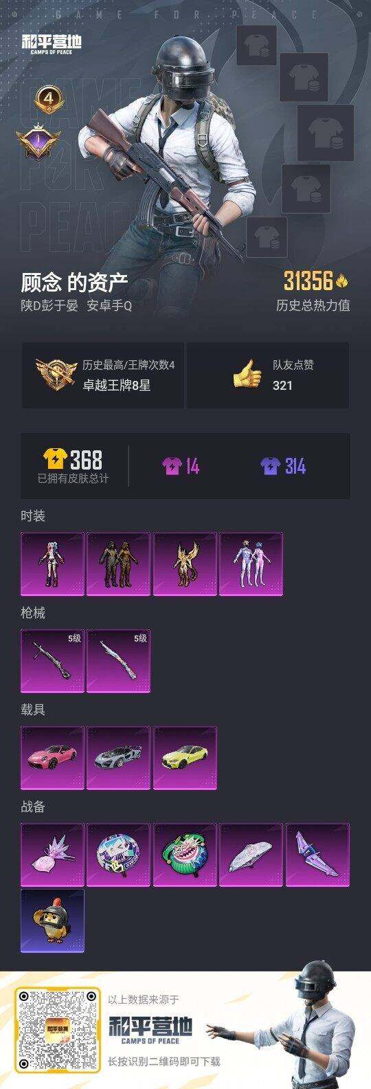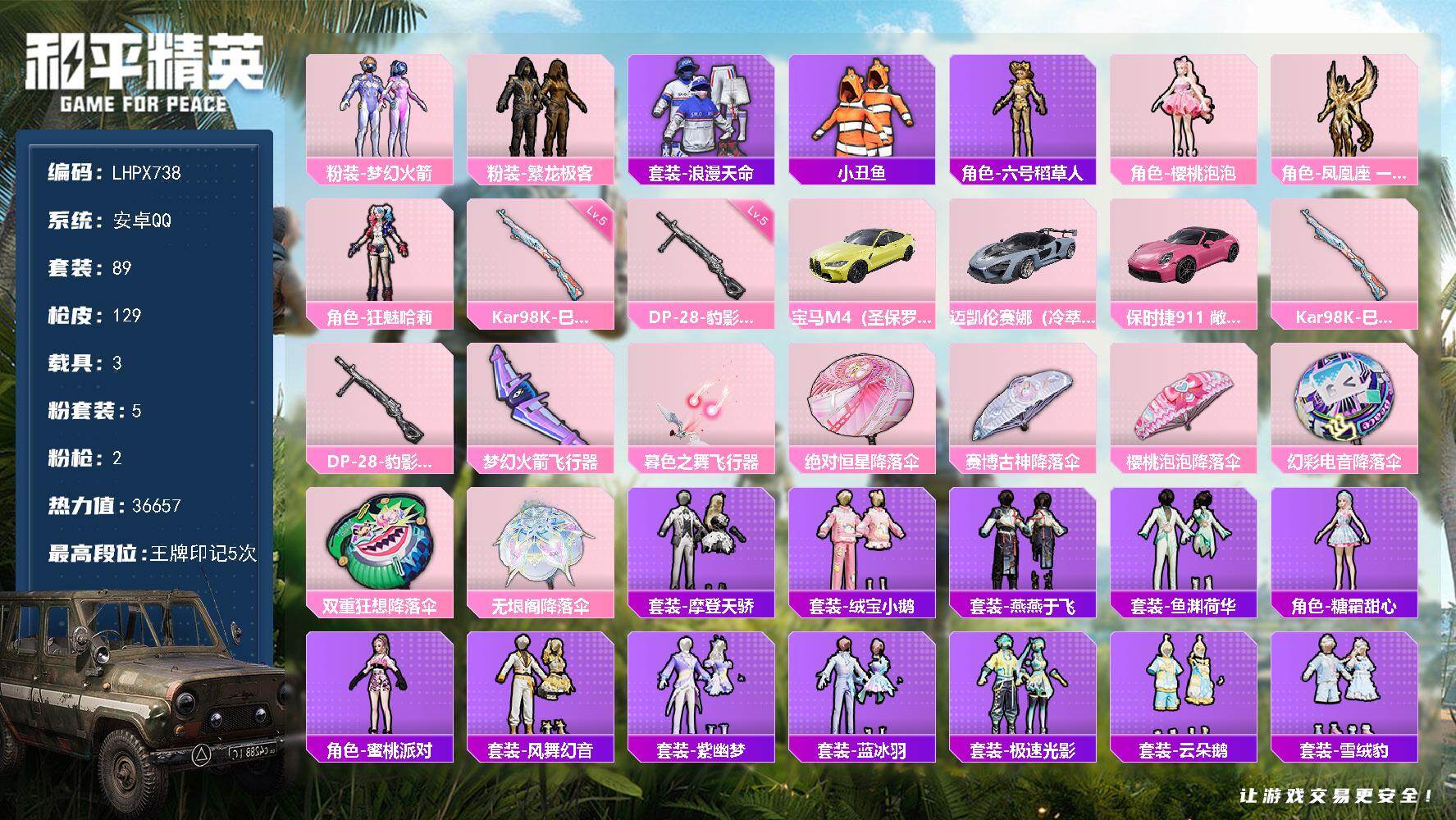 [15905048]【店主推荐捡漏号!可直接换绑】安卓 手Q-5粉装-2特效枪-3载具-3粉色飞行器-36657热力值-5王牌印记-89套装-129枪皮【热门品类】:粉装-梦幻火箭,粉装-繁龙极客,套装-浪漫天命,套装-小丑鱼,角色-六号稻草人【粉色套装】:粉装-梦幻火箭,粉装-繁龙极客,角色-樱桃泡泡,角色-凤凰座 一辉,角色-狂魅哈莉【粉色枪皮等级】:Kar98K-巳巳如意(五级),DP-28-豹影疾电(五级)【粉色载具】:宝马M4(圣保罗黄),迈凯伦塞纳(冷萃蓝),保时捷911 敞篷版(星珀红)【粉色枪皮】:Kar98K-巳巳如意,DP-28-豹影疾电【粉色飞行器】:梦幻火箭飞行器,暮色之舞飞行器