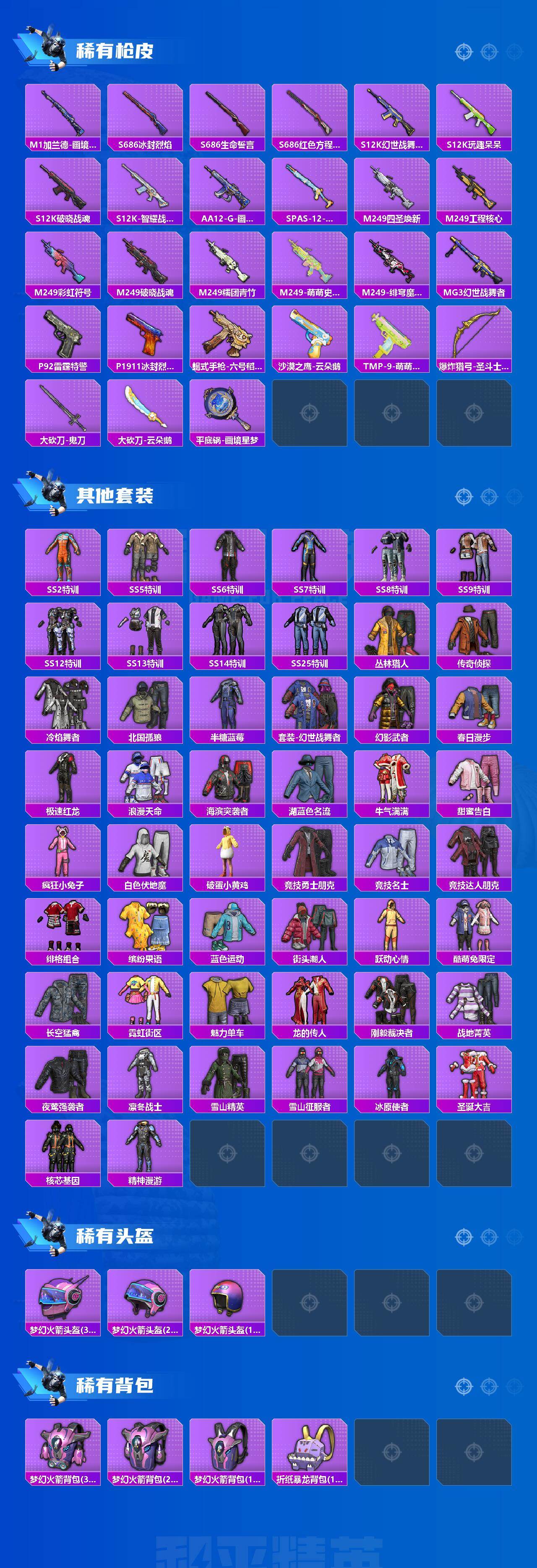 - [16330046]【特价出售/店主推荐最性价比】苹果 手Q-1神装-10粉装-8特效枪-2载具-5粉色飞行器-81622热力值-17王牌印记-167套装-225枪皮 【红色神装等级】:沙丘之主-图卡盟(二级) 【红色角色神装】:沙丘之主-图卡盟 【热门品类】:粉装-梦幻火箭,套装-寒蝎幽灵,套装-浪漫天命,套装-都市猎人,套装-派对舞王,套装-深海小丑鱼,套装-奇异狩猎者,套装-金羽特工,套装-龟仙人,套装-暗影哥特,撬棍-龙胆亮银枪 【粉色套装】:粉装-梦幻火箭,粉装-智能音符,粉装-放客神游,粉装-新星烈龙,粉装-绚金战神,粉装-齐天大圣,粉装-千面幻镜,粉装-闲梦青缨,角色-智耀战神,角色-灵玺 【粉色枪皮等级】:AKM-炫紫旋律(七级),SCAR-L-天蓬元帅(七级),SCAR-L-金蛇镇世(三级),M416-五爪金龙(一级),M416-至情至圣(八级),AUG-超新星(七级),M762-甜蜜誓约(七级),Kar98K-巳巳如意(五级) 【粉色载具】:宾利BATUR(极速紫),护世瑞兽 【粉色枪皮】:AKM-炫紫旋律,SCAR-L-天蓬元帅,SCAR-L-金蛇镇世,M416-五爪金龙,M416-至情至圣,AUG-超新星,M762-甜蜜誓约,Kar98K-巳巳如意 【粉色飞行器】:梦幻火箭飞行器,天之羽翼飞行器,镜光幻境飞行翼,万象金身飞行器 【粉色降落伞】:幻影战神降落伞,百万伏特降落伞,梦幻火箭降落伞,甜蜜誓约降落伞,四圣焕新降落伞,锦绣火鲤降落伞,阿狸红降落伞,香水柠檬降落伞,王牌四分卫降落伞,环太平洋降落伞,太空嘟嘟降落伞,闲梦青缨降落伞,炫光之旅降落伞,精灵梦叶罗丽降落伞,金蛇镇世降落伞,圣域龙灵降落伞 【稀有套装】:套装-龟仙人,套装-巳巳如意,套装-超能元气,套装-雪国风尚,套装-糖糖葫芦,套装-青团波波,套装-燕燕于飞,套装-鱼渊荷华,套装-紫幽梦,套装-蓝冰羽,角色-瑰梦爱神,套装-霓虹热舞,套装-炫彩糖果 【稀有枪皮】:AUG-冰晶雪宝,AKM-2P战斗服款,AKM-夜灯,AKM-影袭,AKM-恐龙拽拽,AKM-灼热熔岩,AKM-破晓战魂,AKM-萌趣颜团子,AKM-虎虎生威,AKM-龙的传人,M16A4-幻世战舞者,M16A4-甜心亚梦,SCAR-L-未来战士,SCAR-L-玉兔迎春,SCAR-L-黄金龙骨,M416-彩虹嘻嘻猴,M416-暗夜行者,M4