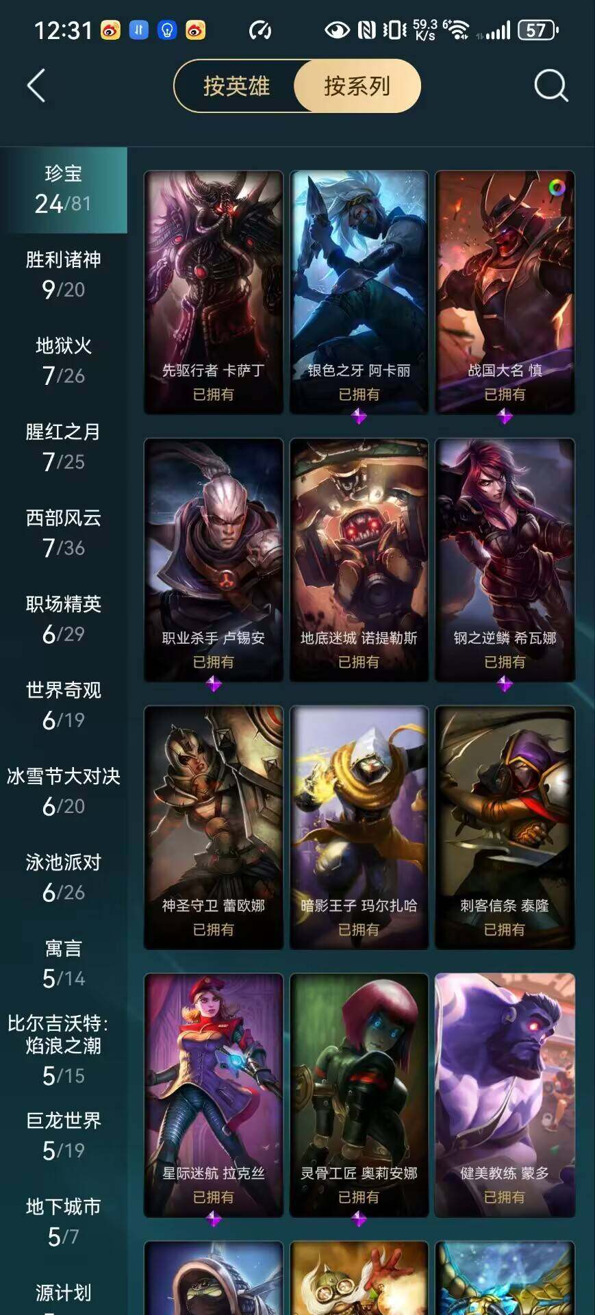 【史诗皮肤】:安伯斯与提妮,腥红之月崔斯特,翼骑统领赵信,摄魂男爵弗拉基米尔,铁钩船长费德提克,圣光审判凯尔,侍魂易,铁血剑豪易,战场公主希维尔,月光女神阿忒弥斯索拉卡,源代码索拉卡,兔宝宝提莫,荒野豺狼沃里克,黑帮狂花厄运小姐,国王泰达米尔,黑色荆棘莫甘娜,炼金狂士辛吉德,飞越疯人院萨科,武动巅峰萨科,掠星魔刃卡萨丁,穿着正装的恶魔维迦,绝代智将斯维因,黑曜