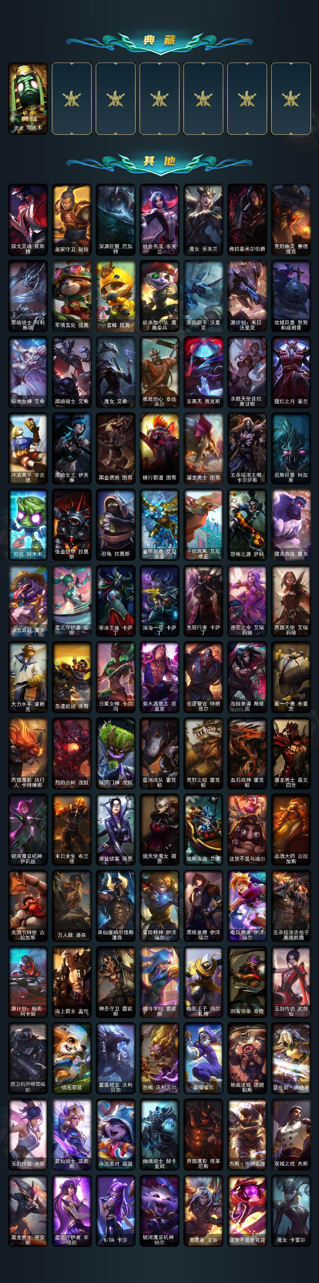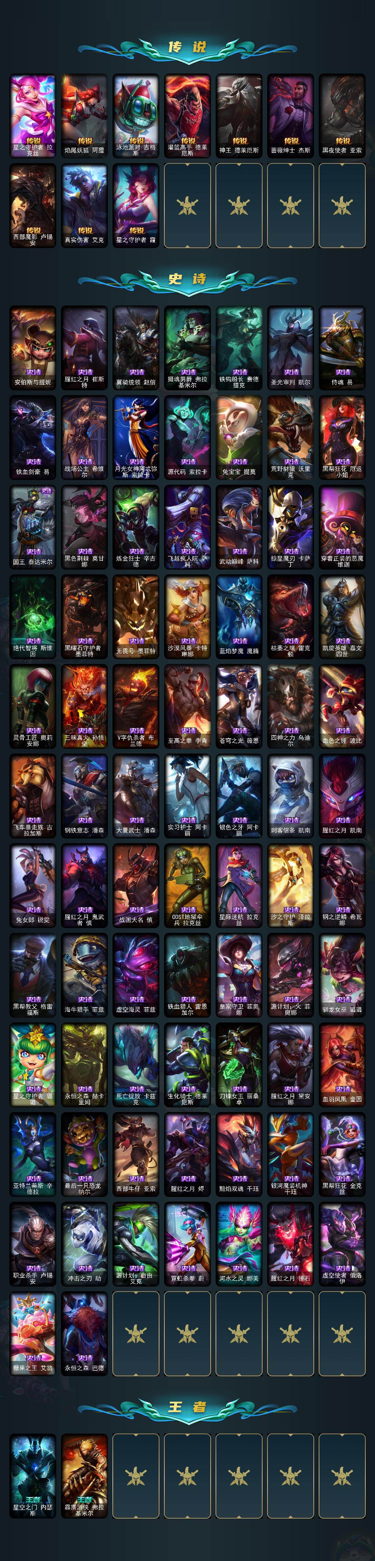 【传说皮肤】:战地机甲厄加特,血石领主弗拉基米尔,大天使长米迦勒凯尔,钢铁之翼凯尔,烈焰雄心崔丝塔娜,女皇艾希,鬼魂新娘莫甘娜,黯晶凤凰艾尼维亚,电玩女神娑娜,女主播迦娜,红色男爵库奇,女警狙击凯特琳,苹果机器人布里茨,上古战魂魔腾,地狱行者孙悟空,源计划净化薇恩,光明哨兵薇恩,第三类接触黑默丁格,炼狱魔犬内瑟斯,战斗学院伊泽瑞尔,死亡骑士盖伦,星之守护者拉克丝,焰尾妖狐阿狸,泳池派对吉格斯,灌篮高手德莱厄斯,神王德莱厄斯,蔷薇绅士杰斯,黑夜使者亚索,西部魔影卢锡安,真实伤害艾克,星之守护者霞