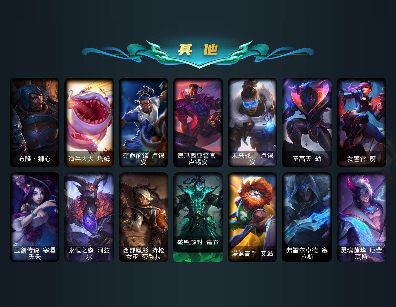 【冰雪限定】:幸福女神乐芙兰,圣诞狂欢努努和威朗普,平安夜女神娑娜,英勇玩具兵普朗克,邪恶圣诞老人维迦,雪默丁格,雪装奈德丽,圣诞玩偶波比,冰雪驯鹿波比,魄罗骑士瑟庄妮,冰雪节玛尔扎哈,冰雪女神辛德拉