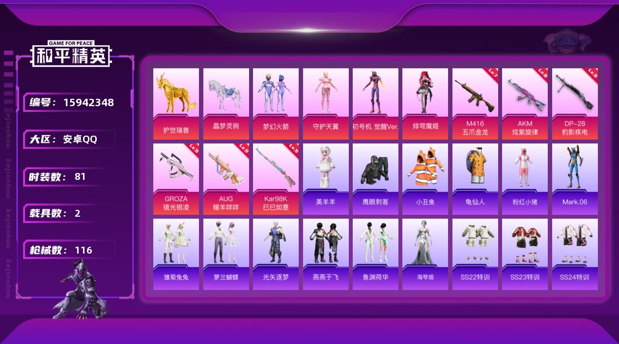 [15942348]【店主推荐捡漏号!可直接换绑】安卓 手Q-4粉装-6特效枪-2载具-2粉色飞行器-38561热力值-7王牌印记-81套装-116枪皮 【热门品类】:粉装-梦幻火箭,套装-小丑鱼,套装-龟仙人,套装-粉红小猪,角色-Mark.06 【粉色套装】:粉装-梦幻火箭,角色-守护天翼,角色-初号机 觉醒Ver.,角色-绯穹魔姬 【粉色枪皮等级】:AKM-炫紫旋律(六级),M416-五爪金龙(七级),GROZA-镜光银凌(五级),AUG-暖羊咩咩(五级),Kar98K-巳巳如意(五级),DP-28-豹影疾电(五级) 【粉色载具】:护世瑞兽,晶梦灵驹 【粉色枪皮】:AKM-炫紫旋律,M416-五爪金龙,GROZA-镜光银凌,AUG-暖羊咩咩,Kar98K-巳巳如意,DP-28-豹影疾电 【粉色飞行器】:拂晓神骑飞行器,万象金身飞行器 【粉色降落伞】:梦幻火箭降落伞,暗夜鎏金降落伞,江南烟雨降落伞,精灵梦叶罗丽降落伞,初号机 觉醒Ver.降落伞,月影灵韵降落伞,金蛇镇世降落伞 【稀有套装】:套装-龟仙人,套装-雏菊兔兔,套装-萝兰蝴蝶,角色-光矢逐梦,套装-燕燕于飞,套装-鱼渊荷华,角色-海琴烟,玩偶服-美羊羊 【稀有枪皮】:AKM-彩虹符号,AKM-江南烟雨,AKM-破晓战魂,AKM-龙的传人,SCAR-L-炫彩节奏,SCAR-L-红色方程式,SCAR-L-黄金龙骨,M416-糯团青竹,M416-红色方程式,GROZA-懵萌河马,GROZA-田园牧歌,AUG-天降萌叽,AUG-耀粉歌者,AUG-金蛇镇世,QBZ-彩虹符号,QBZ-未来歌姬,M762-天降萌叽,M762-第五大道,Mk47-妙红点点,G36C-懵萌河马,AC-VAL-天降萌叽,AC-VAL-快闪甜心,蜜獾-天降萌叽,UZI-天降萌叽,UMP45-圣诞大吉,UMP45-涂山之恋,Vector-田园牧歌,P90-快闪甜心,P90-金蛇镇世,P90-巳巳如意,Kar98K-梦幻火箭,AWM-雷霆特警,SKS-炫彩节奏,SKS-糯团青竹,VSS-田园牧歌,Mini14-梦幻火箭,Mini14-耀粉歌者,SLR-彩虹符号,莫辛纳甘-懵萌河马,AMR-妙红点点,AMR-喜羊羊与灰太狼,M417-惊鸿侠骨,M417-星兔领航员,MK20-H-快闪甜心,M200-惊鸿侠骨,MK12-金蛇镇世,S686-生命誓言,S12K-玩趣呆