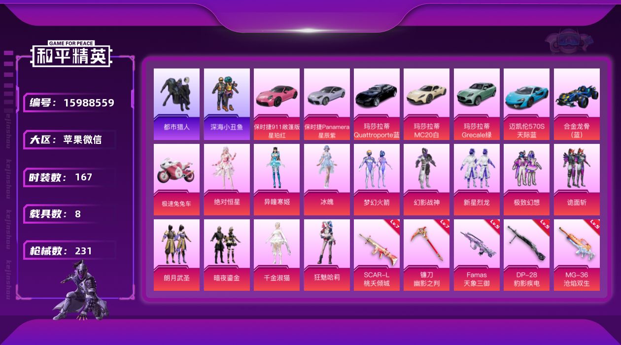 [15988559]苹果 微信-12粉装-8特效枪-8载具-6粉色飞行器-79405热力值-8王牌印记-167套装-231枪皮 【热门品类】:粉装-梦幻火箭,套装-浪漫天命,套装-都市猎人,套装-深海小丑鱼,套装-暗夜行者,套装-暗影哥特 【粉色套装】:角色-绝对恒星,粉装-幻影战神,粉装-梦幻火箭,粉装-新星烈龙,粉装-极致幻想,粉装-诡面斩,粉装-朗月武圣,粉装-暗夜鎏金,角色-千金淑猫,角色-狂魅哈莉,角色-冰魄,角色-异瞳寒姬 【粉色枪皮等级】:SCAR-L-桃夭倾城(七级),SCAR-L-魔童闹海 哪吒(三级),Famas-天象三御(五级),Kar98K-巳巳如意(五级),M249-绝对恒星(一级),DP-28-豹影疾电(五级),MG-36-沧焰双生(五级),镰刀-幽影之判(七级) 【粉色载具】:玛莎拉蒂MC20(星石白),玛莎拉蒂Quattroporte(夜幕蓝),玛莎拉蒂Grecale(薄荷绿),迈凯伦570S(天际蓝),保时捷911 敞篷版(星珀红),保时捷Panamera(星辰紫),合金龙骨(蓝),极速兔兔车 【粉色枪皮】:SCAR-L-桃夭倾城,SCAR-L-魔童闹海 哪吒,Famas-天象三御,Kar98K-巳巳如意,M249-绝对恒星,DP-28-豹影疾电,MG-36-沧焰双生,镰刀-幽影之判 【粉色飞行器】:绝对恒星飞行器,梦幻火箭飞行器,飞天猪飞行器,灵珠游龙飞行器,极意拳锋飞行器 【粉色降落伞】:绝对恒星降落伞,甜心宝贝降落伞,梦幻火箭降落伞,神秘黑猫降落伞,诡面斩降落伞,荧光虫舞降落伞,香水柠檬降落伞,星之彼岸降落伞,暗夜玫瑰降落伞,海渊国主降落伞,垂柳戏鸭降落伞,桃夭倾城降落伞,仲夏莫吉托降落伞,双重狂想降落伞,无垠阁降落伞,喜羊羊与灰太狼降落伞,魔童闹海 哪吒降落伞,异瞳寒姬降落伞,炫彩糖果降落伞 【稀有套装】:角色-超感刻度,角色-甜心蒙太奇,套装-雪国风尚,套装-炫彩糖果,角色-瑰梦爱神,套装-云朵鹅,套装-雪绒豹,套装-诡诞巡游,套装-混沌火种,角色-时希公主,套装-朱霞炽焰,套装-凌霄紫焰,套装-擎苍青焰,角色-申公豹,角色-紫俏灵猫,角色-紫霄电母,角色-玄霖雨神,套装-书海巡游,套装-画境星梦,套装-琴音绮想 【稀有枪皮】:AUG-冰晶雪宝,AKM-夜灯,AKM-奇异狩猎者,AKM-彩虹符号,AKM-星之彼岸,AKM-海渊国主,AKM-