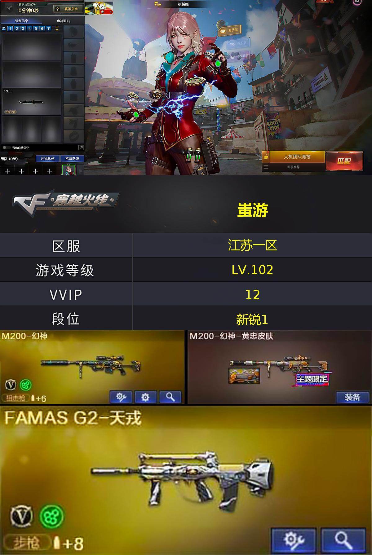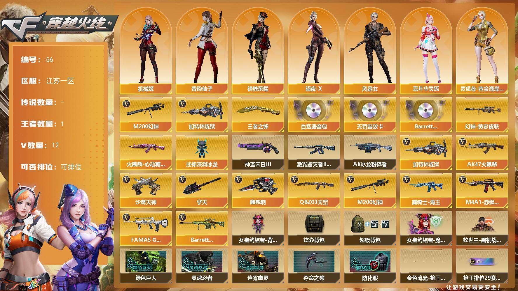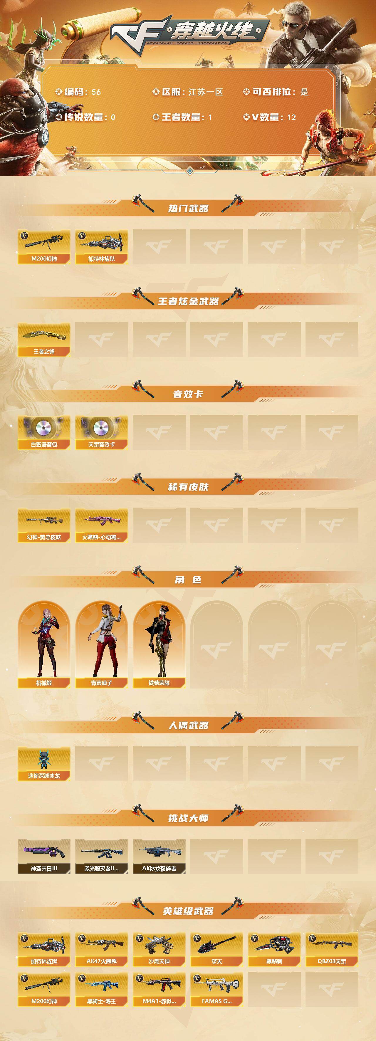[16010749]江苏一区-12V-1王者-0炫金 【热门武器】:M200-幻神,加特林-炼狱 【王者炫金武器】:王者之锋 【音效卡】:白鲨语音包,QBZ03-天罚音效卡,Barrett-碧霄极光音效卡*3 【皮肤】:M200-幻神-黄忠皮肤,火麒麟-心动糖果 【角色】:机械姬,暗夜-X,风暴女,嘉年华灵狐,灵狐者-黄金海岸,青霞仙子,斯沃特-X,铁骑荣耀,樱-战斗天使,影武者-X 【人偶武器】:迷你深渊冰龙 【挑战大师】:AK47-冰龙粉碎者,激光毁灭者III-白马银枪,神圣爆裂者-末日III 【英雄级武器】:AK47-火麒麟,QBZ03-天罚,FAMAS G2-天戎,黑骑士-海王,M200-幻神,加特林-炼狱,沙鹰-天神,擎天,麒麟刺,M4A1-赤狱骑士,Barrett-碧霄极光 【道具】:女皇终结者-背包,炫彩背包,超级背包,女皇终结者-魔龙之吻,救世主-黑桃战神,绿色巨人,灵魂忍者,迷雾幽灵,夺命之镰,防化服*3,金色流光-枪王排位*2,星辰流光-枪王排位,枪王排位28赛季金色流光,枪王排位29赛季金色流光,防弹头盔*3,防弹衣*3,C4工具钳*3,手雷包*3 【特殊枪械】:1炼狱