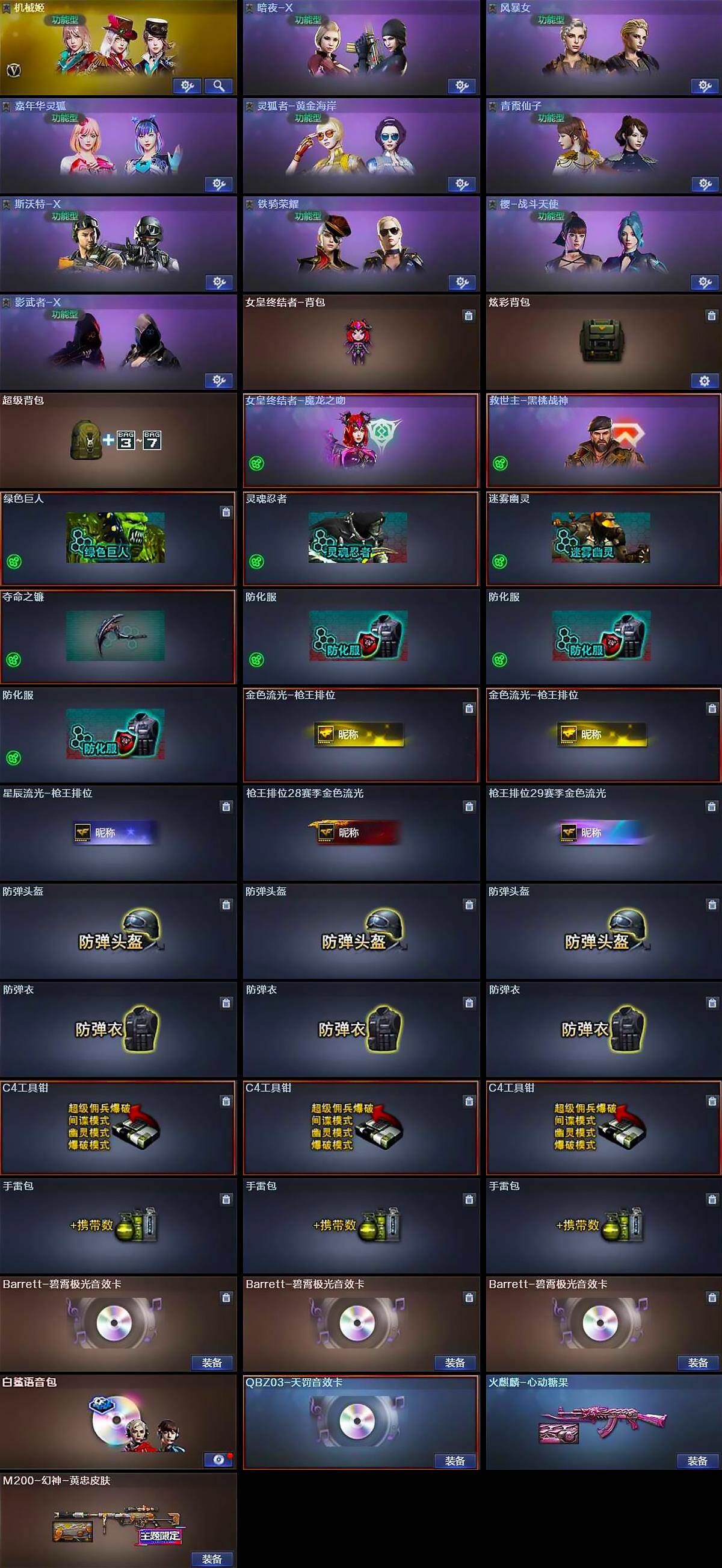 【道具】:女皇终结者-背包,炫彩背包,超级背包,女皇终结者-魔龙之吻,救世主-黑桃战神,绿色巨人,灵魂忍者,迷雾幽灵,夺命之镰,防化服*3,金色流光-枪王排位*2,星辰流光-枪王排位,枪王排位28赛季金色流光,枪王排位29赛季金色流光,防弹头盔*3,防弹衣*3,C4工具钳*3,手雷包*3