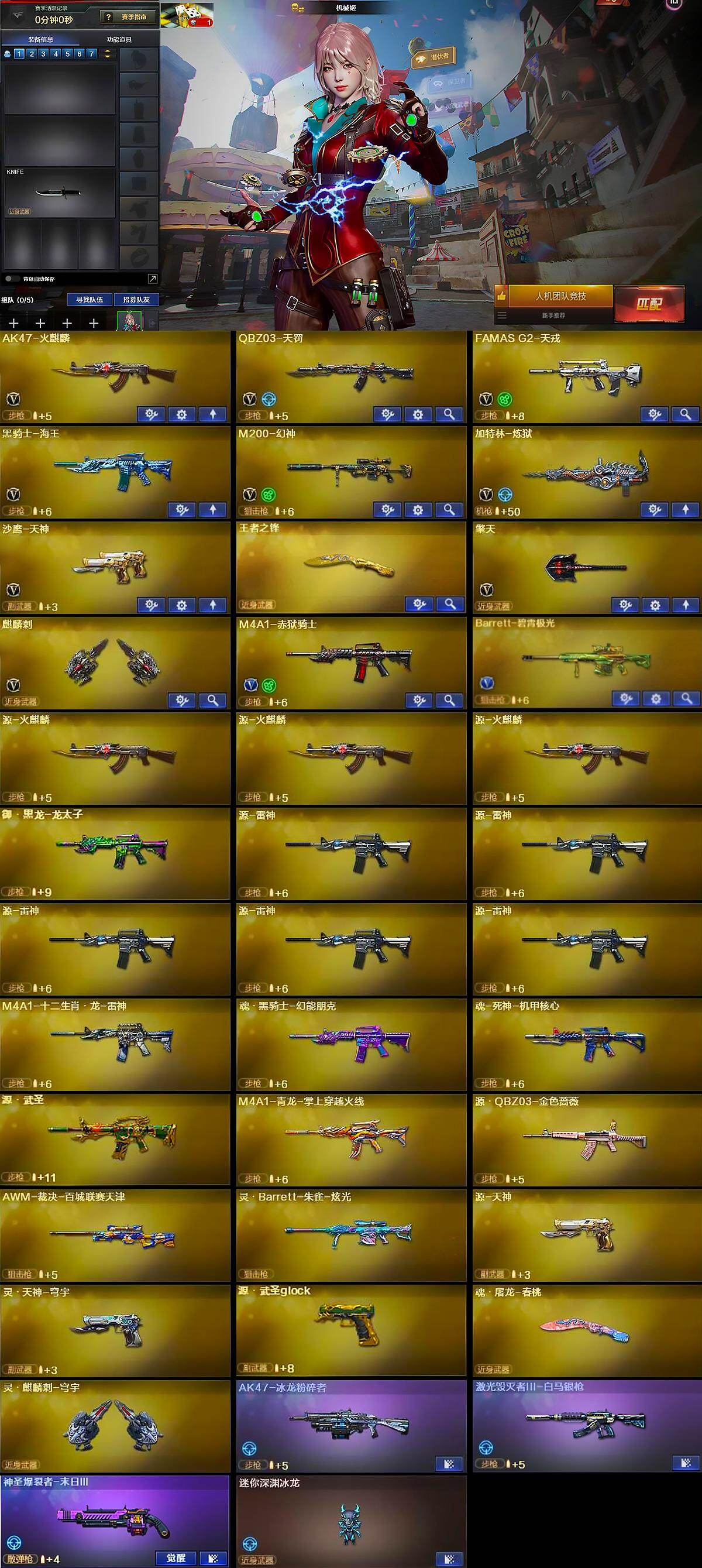 【英雄级武器】:AK47-火麒麟,QBZ03-天罚,FAMAS G2-天戎,黑骑士-海王,M200-幻神,加特林-炼狱,沙鹰-天神,擎天,麒麟刺,M4A1-赤狱骑士,Barrett-碧霄极光