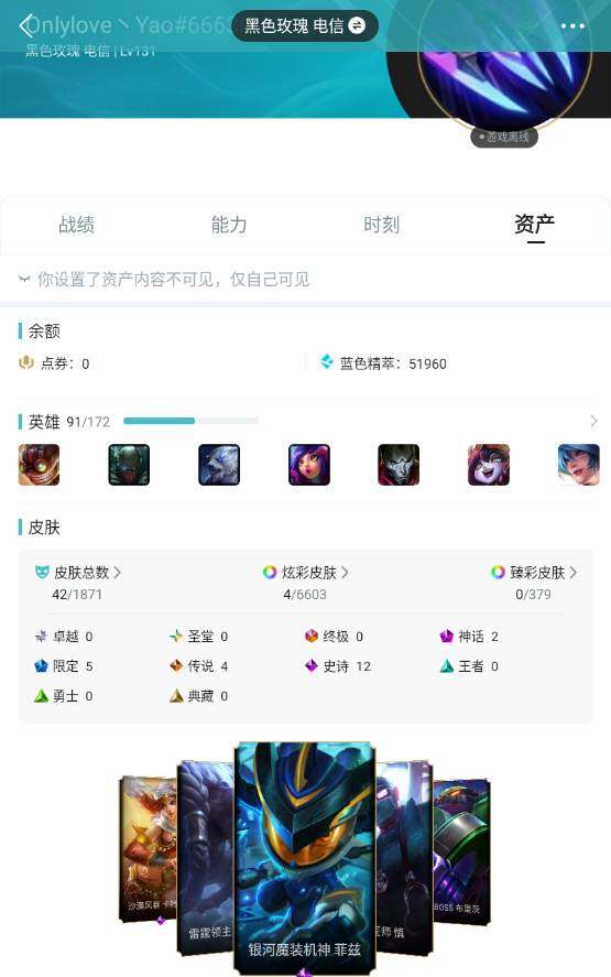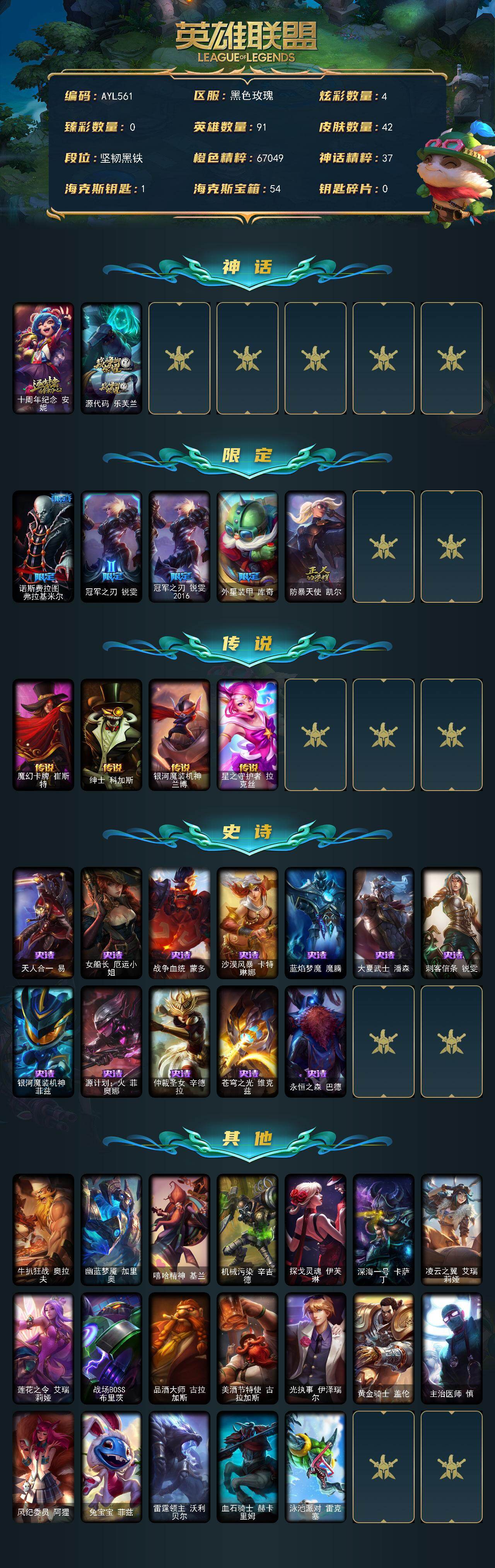 [16012689]【可二次特价出售/店主推荐】未定级段位-91英雄-42皮肤-4炫彩-0终极-2神话-5限定-4传说-12史诗