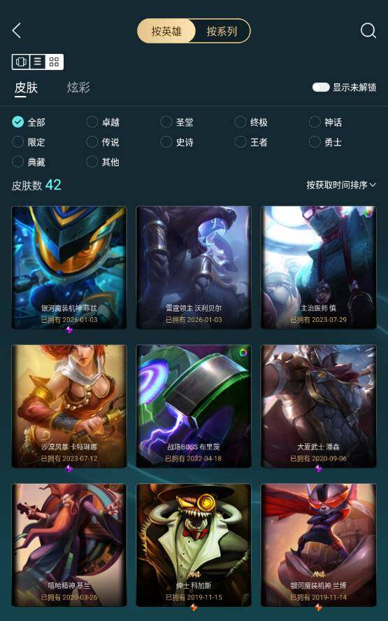【传说皮肤】:魔幻卡牌崔斯特,绅士科加斯,银河魔装机神兰博,星之守护者拉克丝
