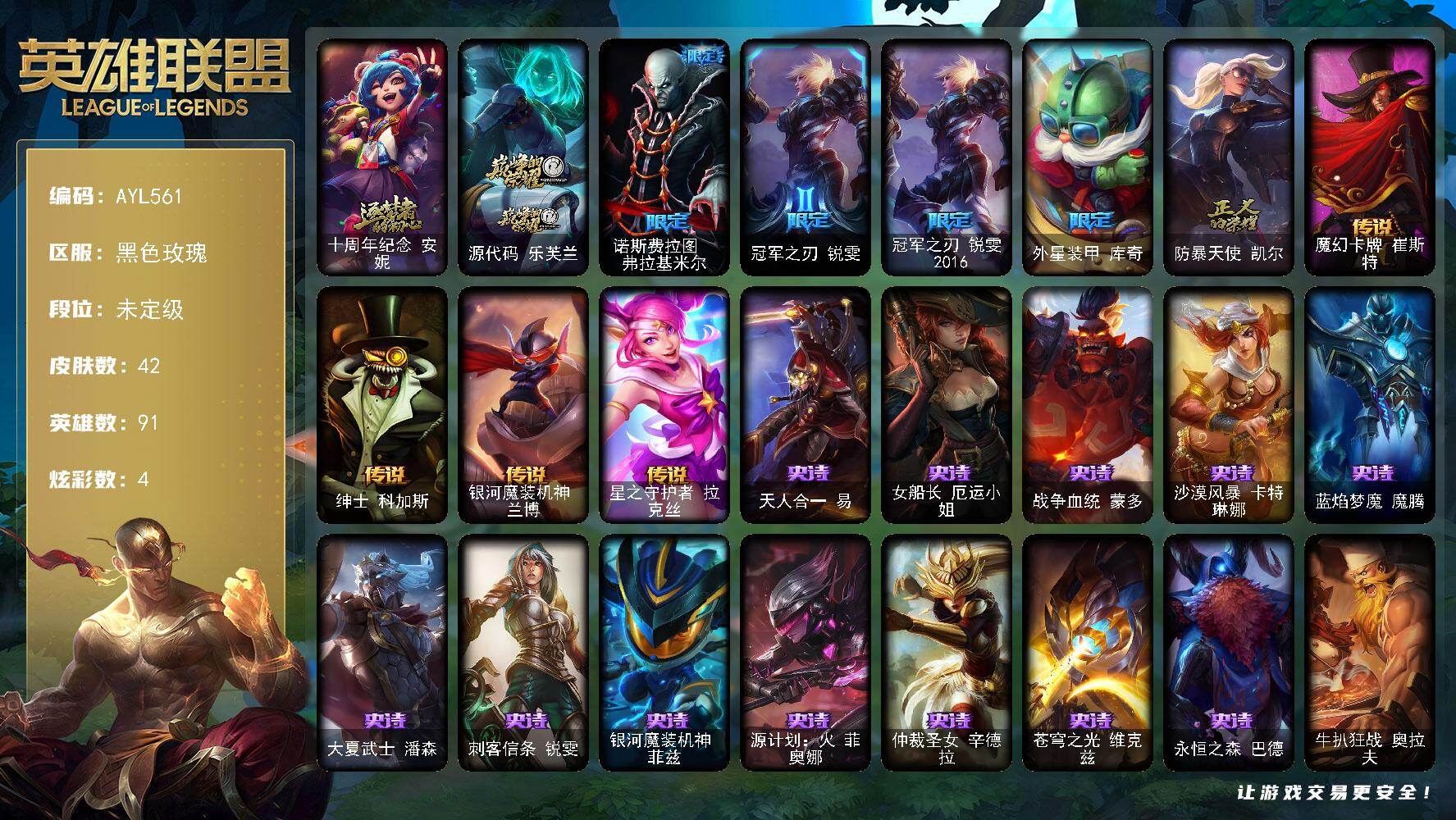 [16012689]【可二次特价出售/店主推荐】未定级段位-91英雄-42皮肤-4炫彩-0终极-2神话-5限定-4传说-12史诗 【神话皮肤】:十周年纪念安妮,源代码乐芙兰 【限定皮肤】:诺斯费拉图弗拉基米尔,冠军之刃锐雯,冠军之刃锐雯2016,外星装甲库奇,防暴天使凯尔 【传说皮肤】:魔幻卡牌崔斯特,绅士科加斯,银河魔装机神兰博,星之守护者拉克丝 【史诗皮肤】:天人合一易,女船长厄运小姐,战争血统蒙多,沙漠风暴卡特琳娜,蓝焰梦魔魔腾,大夏武士潘森,刺客信条锐雯,银河魔装机神菲兹,源计划火菲奥娜,仲裁圣女辛德拉,苍穹之光维克兹,永恒之森巴德 【其他皮肤1】:牛扒狂战奥拉夫,幽蓝梦魇加里奥,嘻哈精神基兰,机械污染辛吉德,探戈灵魂伊芙琳,深海一号卡萨丁,凌云之翼艾瑞莉娅,莲花之令艾瑞莉娅,战场BOSS布里茨,品酒大师古拉加斯,美酒节特使古拉加斯,光执事伊泽瑞尔,黄金骑士盖伦,主治医师慎,风纪委员阿狸,兔宝宝菲兹,雷霆领主沃利贝尔,血石骑士赫卡里姆,泳池派对雷克塞