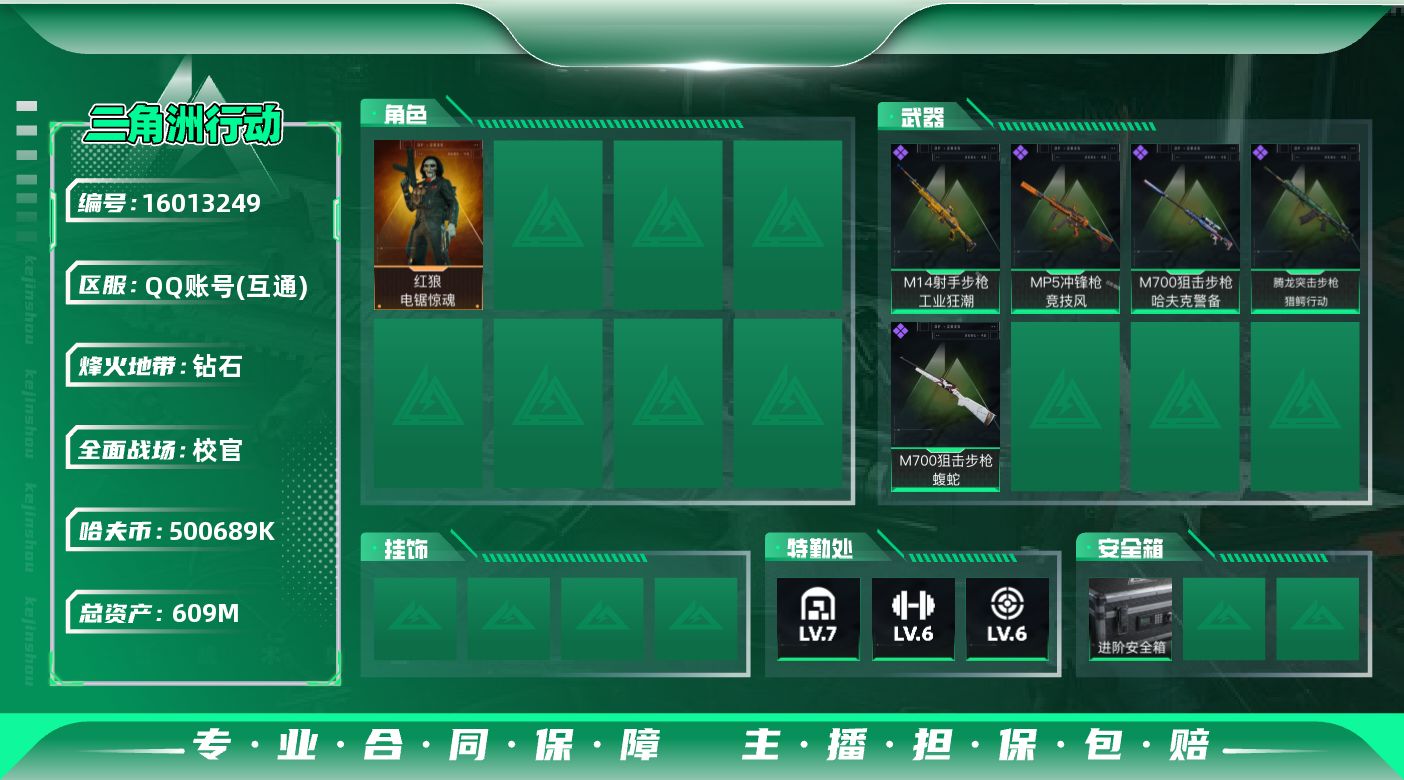 [16013249]【特价出售/店主推荐】 609m总资产-500689k哈伏币-60烽火等级-钻石-40战场等级-校官 【干员外观】:红狼-电锯惊魂 【近战皮肤】:近战-黑鹰 【史诗外观】:腾龙突击步枪-猎鳄行动,MP5冲锋枪-竞技风,M14射手步枪-工业狂潮,M700狙击步枪-蝮蛇,M700狙击步枪-哈夫克警备 【稀有外观】:K437突击步枪-巨兽,AKM突击步枪-肃杀,M7战斗步枪-前沿科技,腾龙突击步枪-冰天雪地,MP5冲锋枪-哈夫克卫队,Vector冲锋枪-先锋,UZI冲锋枪-亚特兰蒂斯,SMG-45-行动开启,SMG-45冲锋枪-幻影结构,SMG-45冲锋枪-精英联盟,勇士冲锋枪-精英联盟,勇士冲锋枪-冰天雪地,M1014霰弹枪-幻影结构,QJB201轻机枪-哈夫克卫队,Mini-14射手步枪-荣耀列队,SR-25射手步枪-开拓,SR9射手步枪-肃杀,G18-星链科技,G18-哈夫克航天 【普通外观】:UZI冲锋枪-蛇纹涂装,M249轻机枪-古铜,AKM突击步枪-噬菌体,M7战斗步枪-噬菌体,M4A1突击步枪-红色涂装,M4A1突击步枪-高雅黑,QBZ95-1突击步枪-海浪,QBZ95-1突击步枪-海色,QBZ191突击步枪-三角洲力量,K416突击步枪-几何迷彩,K416突击步枪-高雅黑,M16A4突击步枪-高雅黑,SG552突击步枪-浅蓝涂装,SG552突击步枪-海浪,G3战斗步枪-高雅黑,MP5冲锋枪-海色,MP5冲锋枪-黄蜂,Vector冲锋枪-几何迷彩,野牛冲锋枪-高雅黑,SR-3M紧凑突击步枪-三角洲力量,M1014霰弹枪-高雅黑,M249轻机枪-黄蜂,SVD狙击步枪-高雅黑,SR-25射手步枪-黄蜂,SV-98狙击步枪-红色涂装,沙漠之鹰-海浪,93R-三角洲力量 【载具外观】:突击直升机-英雄 【挂饰】:挂饰-窃风密探,挂饰-崩岩重炮*6,挂饰-暗行哨兵*8,挂饰-枪匠