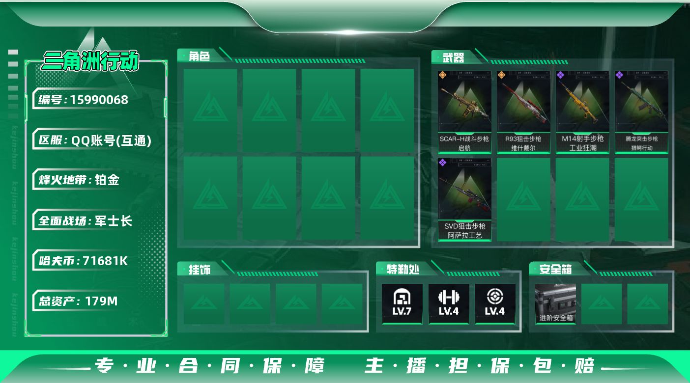 [15990068]【特价出售/店主推荐】179m总资产-71681k哈伏币-54烽火等级-铂金-23战场等级-军士长 【近战皮肤】:近战-黑鹰 【传说外观】:SCAR-H战斗步枪-启航,R93狙击步枪-维什戴尔 【史诗外观】:腾龙突击步枪-猎鳄行动,SVD狙击步枪-阿萨拉工艺,M14射手步枪-工业狂潮 【稀有外观】:M4A1突击步枪-零点,AKM突击步枪-肃杀,K416突击步枪-碳纤维,K416突击步枪-前沿科技,AK-12突击步枪-零点,MP5冲锋枪-哈夫克卫队,Vector冲锋枪-先锋,SMG-45-行动开启,勇士冲锋枪-冰天雪地,QJB201轻机枪-哈夫克卫队,Mini-14射手步枪-荣耀列队,SVD狙击步枪-战术行动,SKS射手步枪-弄臣,SR-25射手步枪-开拓,SR9射手步枪-肃杀,SV-98狙击步枪-星链科技,SV-98狙击步枪-哈夫克航天,SV-98狙击步枪-精英联盟,G18-星链科技,G18-哈夫克航天 【普通外观】:S12K霰弹枪-古铜,M4A1突击步枪-粉色涂装,M4A1突击步枪-高雅黑,QBZ95-1突击步枪-高雅黑,QBZ95-1突击步枪-海色,QBZ191突击步枪-三角洲力量,K416突击步枪-几何迷彩,M16A4突击步枪-高雅黑,M7战斗步枪-红色涂装,SCAR-H战斗步枪-数码迷彩,G3战斗步枪-高雅黑,PTR-32突击步枪-黄蜂,MP5冲锋枪-海色,MP5冲锋枪-黄蜂,Vector冲锋枪-几何迷彩,野牛冲锋枪-高雅黑,M1014霰弹枪-高雅黑,M1014霰弹枪-海浪,SVD狙击步枪-高雅黑,SR-25射手步枪-黄蜂,SV-98狙击步枪-红色涂装,沙漠之鹰-高雅黑 【载具外观】:轮式突击炮-荣耀 【挂饰】:挂饰-赤霄游龙,挂饰-维什戴尔,挂饰-诡影狙击兵*3,挂饰-诡影喷火兵*2,挂饰-崩岩重炮,挂饰-暗行哨兵*2,挂饰-启程