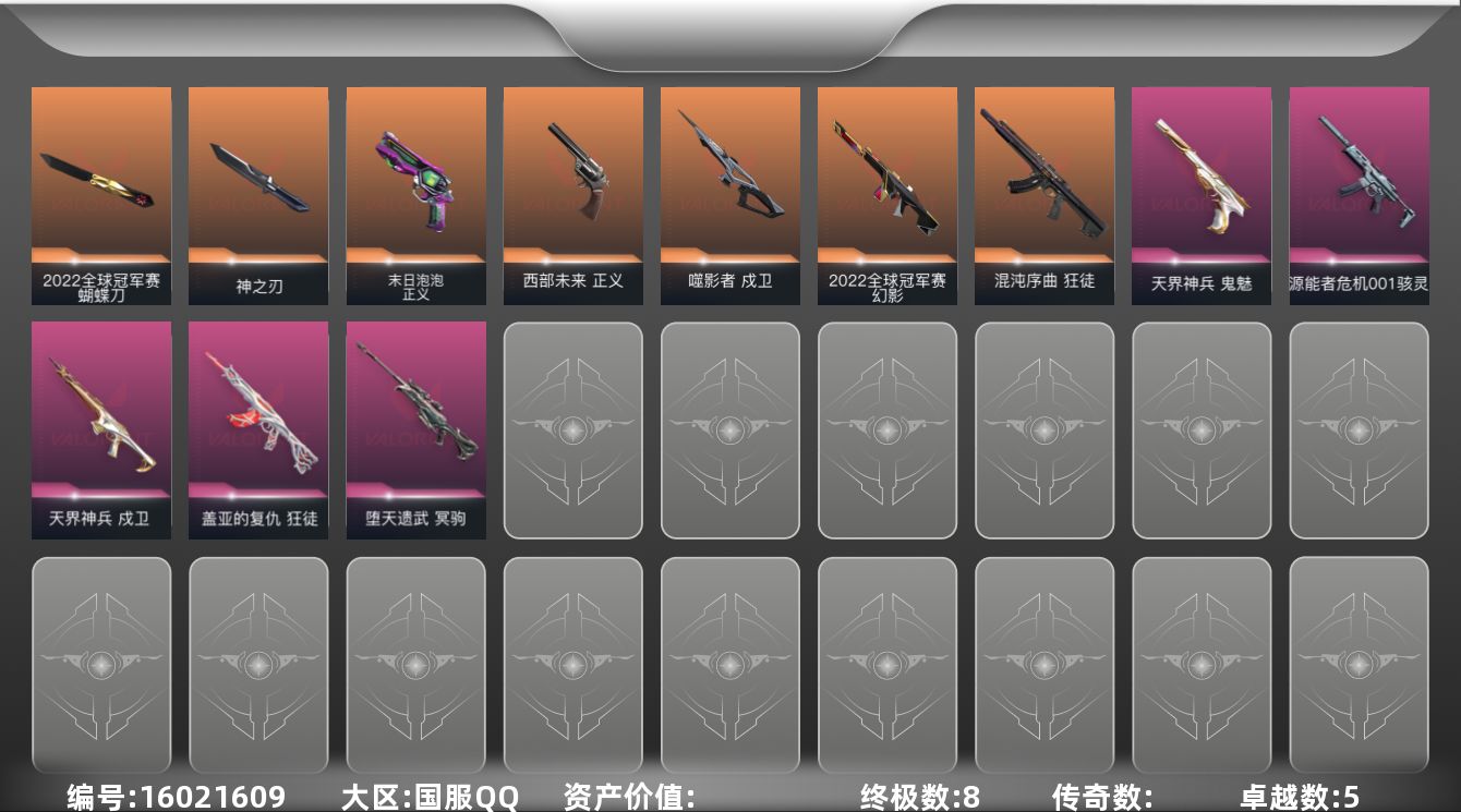 [16021609]【套装】:2022全球冠军赛套装 【英雄】:幻棱,炼狱,暮蝶,钛狐,壹决,铁臂,捷风,雷兹,幽影,不死鸟,贤者,猎枭,芮娜,尚勃勒,霓虹,斯凯,夜露,盖可,黑梦,钢锁 【近战武器】:近战武器-2022全球冠军赛 蝴蝶刀,近战武器-神之刃 【狂徒】:狂徒-混沌序曲,狂徒-盖亚的复仇 【幻影】:幻影-2022全球冠军赛 【戍卫】:戍卫-噬影者,戍卫-天界神兵 【冥驹】:冥驹-堕天遗武 【骇灵】:骇灵-源能者危机001,骇灵-无限竞技 【正义】:正义-西部未来,正义-末日泡泡 【鬼魅】:鬼魅-天界神兵,鬼魅-灵魂消声者 【卡面】:树懒大作战 卡面,红鳞松叶 卡面,战术熊与伙伴们 卡面,无畏契约GO!第一卷:芮娜 卡面,无畏契约GO!第一卷:零 卡面,《双城之战》金克丝 卡面,战术小伙伴 卡面,钢锁vs盖可 卡面,代号红色 卡面,新兵报到 卡面,V契约 卡面,无畏契约 卡面 【喷漆】:小丑猫 喷漆,买装还是存钱 喷漆,红鳞 喷漆,暴走萝莉 喷漆,松叶 喷漆,放下武器 喷漆,胜利属于无畏契约 喷漆,GLHF 喷漆,无畏契约 喷漆 【挂饰】:无畏契约GO!第一卷 芮娜 挂饰,无畏契约GO!第一卷 零 挂饰,鱼骨头 挂饰,薰衣草之心 挂饰,天外飞客 挂饰,《双城之战》魄罗 挂饰,无畏契约 纪念币 挂饰