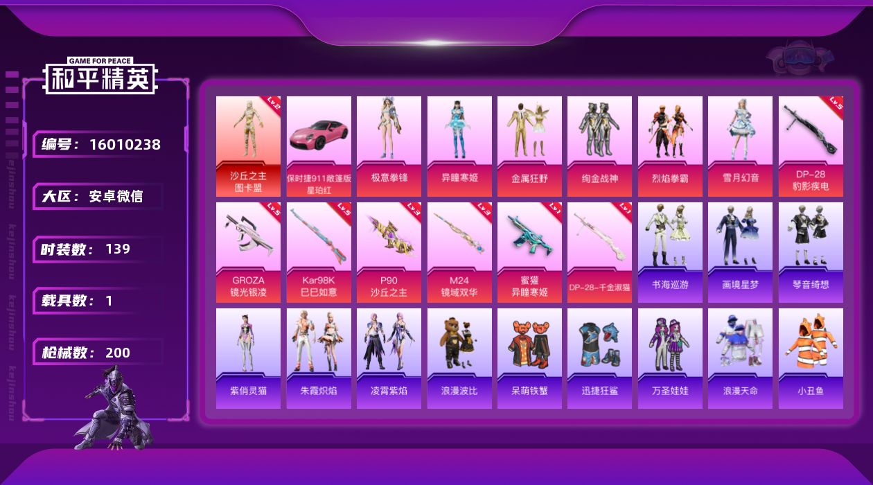 [16010238]【特价出售/店主推荐】安卓 微信-1神装-6粉装-7特效枪-1载具-7粉色飞行器-59919热力值-12王牌印记-139套装-200枪皮【红色神装等级】:沙丘之主-图卡盟(二级)【红色角色神装】:沙丘之主-图卡盟【热门品类】:套装-浪漫天命,套装-小丑鱼,套装-龟仙人,套装-暗影哥特,套装-浪漫波比,套装-粉红小猪【粉色套装】:粉装-金属狂野,粉装-绚金战神,粉装-烈焰拳霸,粉装-雪月幻音,角色-异瞳寒姬,粉装-极意拳锋【粉色枪皮等级】:GROZA-镜光银凌(五级),蜜獾-异瞳寒姬(一级),P90-沙丘之主(三级),Kar98K-巳巳如意(五级),M24-镜域双华(三级),DP-28-千金淑猫(一级),DP-28-豹影疾电(五级)【粉色载具】:保时捷911 敞篷版(星珀红)【粉色枪皮】:GROZA-镜光银凌,蜜獾-异瞳寒姬,P90-沙丘之主,Kar98K-巳巳如意,M24-镜域双华,DP-28-千金淑猫,DP-28-豹影疾电【粉色飞行器】:酣梦熊熊飞行器,沙丘之主天马,镜域双华-灵镜之阶,龙翔九天飞行器,幽焰列车飞行器,极意拳锋飞行器