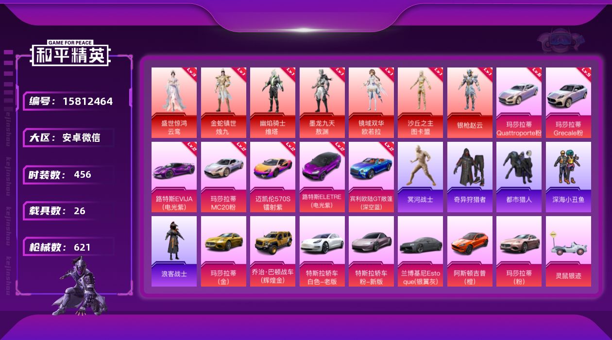 [15812464]送手机!裙子号!背包材料很多!安卓 微信-无敌战神框-7神装-105粉装-84特效枪-26载具-47粉色飞行器-353294热力值-24王牌印记-456套装-621枪皮 【红色载具】:路特斯ELETRE(电光紫)(二级),路特斯EVIJA(电光紫)(二级),玛莎拉蒂MC20(幻星粉)(二级),玛莎拉蒂Quattroporte(幻星粉)(六级),玛莎拉蒂Grecale(幻星粉)(五级),迈凯伦570S(镭射紫)(二级),宾利欧陆GT敞篷(深空蓝)(二级) 【红色神装等级】:金蛇镇世-烛九(一级),盛世惊鸿-云鸾(三级),幽焰骑士-维塔(一级),墨龙九天-敖渊(一级),镜域双华-欧若拉(一级),沙丘之主-图卡盟(一级),角色-银枪赵云(一级) 【红色角色神装】:金蛇镇世-烛九,盛世惊鸿-云鸾,幽焰骑士-维塔,墨龙九天-敖渊,镜域双华-欧若拉,沙丘之主-图卡盟,角色-银枪赵云 【热门品类】:粉装-怪诞乔克,粉装-雪国幻梦,粉装-梦幻火箭,粉装-童趣迷兔,粉装-缤纷油彩,套装-都市猎人,套装-冥河战士,套装-深海小丑鱼,套装-小丑鱼,套装-奇异狩猎者,角色-军刀雅典娜,套装-忍者信条,套装-暗夜行者,套装-浪客战士,角色-忠猛周仓,角色-忠真马岱,角色-忠义严颜,套装-龟仙人,套装-暗影哥特,大砍刀-青龙偃月刀,撬棍-龙胆亮银枪 【粉色套装】:粉装-幻影战神,粉装-数码大师,粉装-未来战士,粉装-粉色回忆,粉装-怪诞乔克,粉装-甜心巧克力,粉装-宝贝奶油派,粉装-天使彩虹糖,粉装-雪国幻梦,粉装-蝶舞迷情,粉装-梦幻火箭,粉装-星之信仰,粉装-金属狂野,粉装-缤纷油彩,粉装-古堡领主,粉装-天禅智恒,粉装-新星烈龙,粉装-甜蜜誓约,粉装-扶摇飞仙,粉装-花间之火,粉装-草莓生巧,粉装-苍蓝魅影,粉装-翡翠骑士,粉装-绚金战神,粉装-冰霜白皇,粉装-童趣迷兔,粉装-炙焰红王,粉装-香水柠檬,粉装-暗翼战神,粉装-星之彼岸,粉装-相思残雪,粉装-馨动时刻,粉装-蜜桃特工,粉装-暗夜玫瑰,角色-闪耀迪迦,角色-赛罗闪耀型,角色-洛天依,粉装-沙场疾风,粉装-海渊国主,角色-零号机款机体服,角色-初号机款机体服,角色-2号机款机体服,粉装-精灵娃娃,粉装-酣梦娃娃,粉装-天之羽翼,粉装-碧影闪光,粉装-海盐物语,粉装-幻梦音符,粉装-闪耀律动,粉装-橘柚倾心,粉装-筑梦精灵,粉装