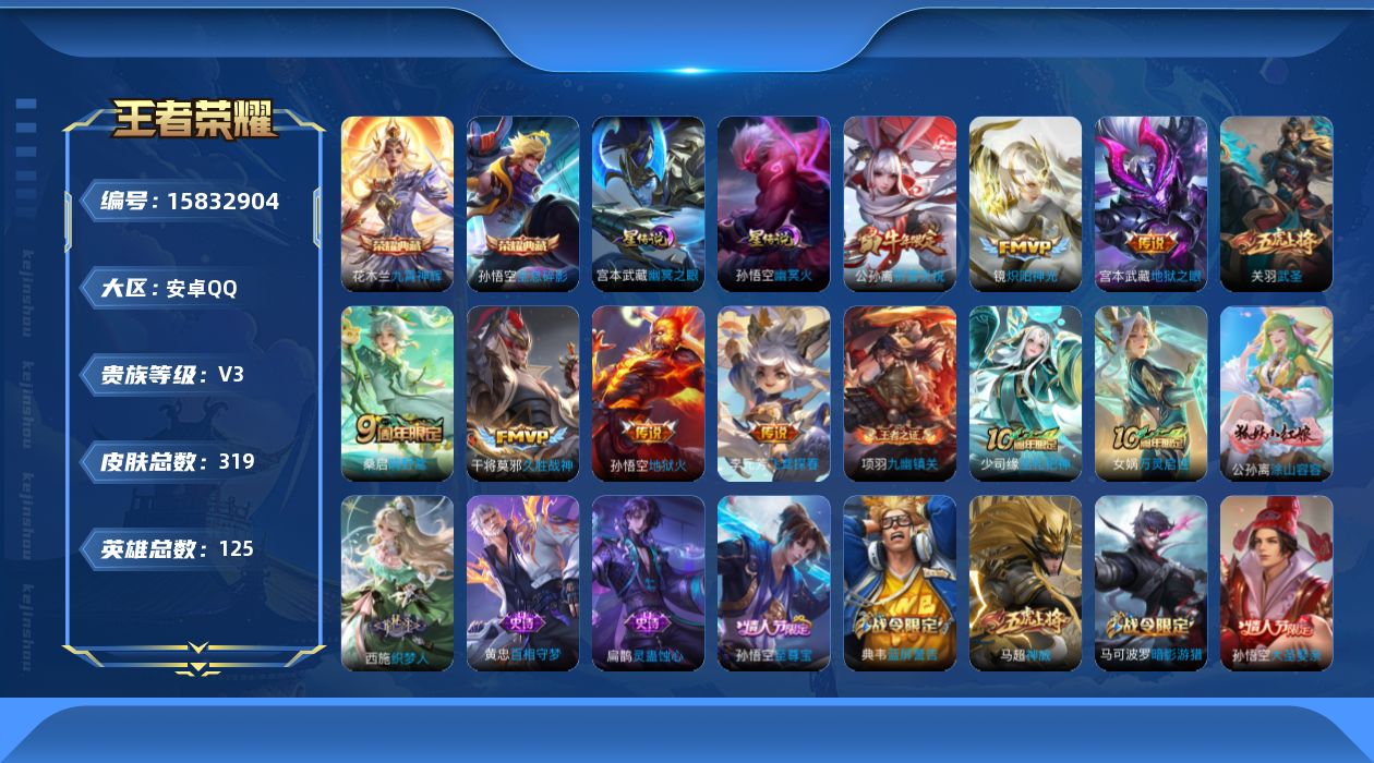 - PX_2093862-实名: 可修改 贵族等级: V6 英雄数: 105 皮肤数: 80 传说皮: 时之恋人-刘备 限定皮: 异界灵契,青春决赛季,朱雀志,一生所爱,傲雪梅枪,时之祈愿-云中君