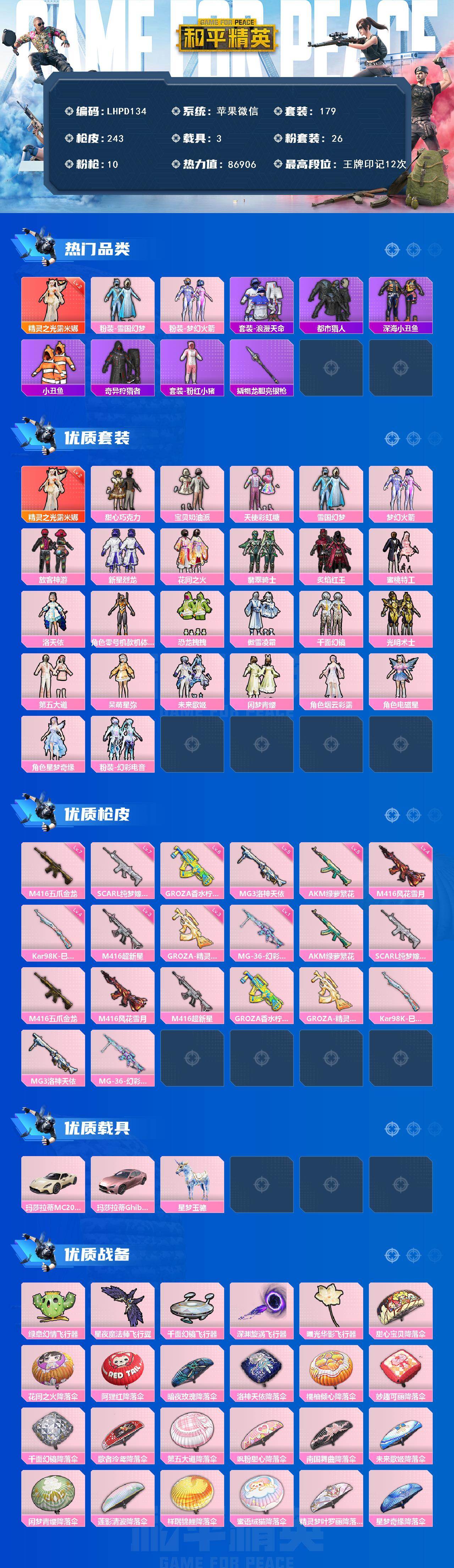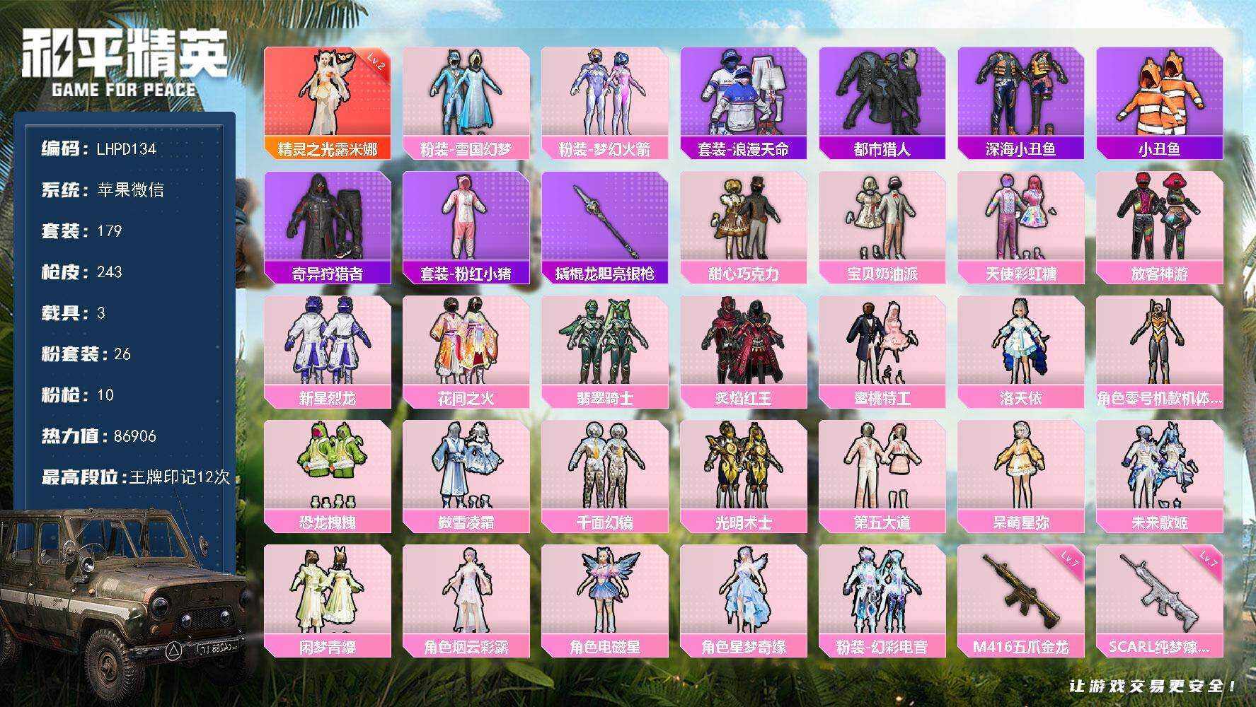 [15833924]【特价出售/店主推荐】苹果 微信-1神装-26粉装-10特效枪-3载具-5粉色飞行器-86906热力值-12王牌印记-179套装-243枪皮【红色神装等级】:精灵之光-露米娜(二级)【红色角色神装】:精灵之光-露米娜【热门品类】:粉装-雪国幻梦,粉装-梦幻火箭,套装-浪漫天命,套装-都市猎人,套装-深海小丑鱼,套装-小丑鱼,套装-奇异狩猎者,套装-粉红小猪,撬棍-龙胆亮银枪【粉色套装】:粉装-甜心巧克力,粉装-宝贝奶油派,粉装-天使彩虹糖,粉装-雪国幻梦,粉装-梦幻火箭,粉装-放客神游,粉装-新星烈龙,粉装-花间之火,粉装-翡翠骑士,粉装-炙焰红王,粉装-蜜桃特工,角色-洛天依,角色-零号机款机体服,粉装-恐龙拽拽,粉装-傲雪凌霜,粉装-千面幻镜,粉装-光明术士,粉装-第五大道,角色-呆萌星弥,粉装-未来歌姬,粉装-闲梦青缨,角色-烟云彩露,角色-电磁星,角色-星梦奇缘,粉装-幻彩电音【粉色枪皮等级】:AKM-绿萝繁花(五级),SCAR-L-纯梦嫁纱(七级),M416-五爪金龙(七级),M416-风花雪月(四级),M416-超新星(三级),GROZA-香水柠檬(六级),GROZA-精灵之光(三级),Kar98K-巳巳如意(四级),MG3-洛神天依(五级),MG-36-幻彩电音(一级)【粉色载具】:玛莎拉蒂MC20(星石白),玛莎拉蒂Ghibli(粉),星梦玉骢【粉色枪皮】:AKM-绿萝繁花,SCAR-L-纯梦嫁纱,M416-五爪金龙,M416-风花雪月,M416-超新星,GROZA-香水柠檬,GROZA-精灵之光,Kar98K-巳巳如意,MG3-洛神天依,MG-36-幻彩电音【粉色飞行器】:绿意幻情飞行器,星夜魔法师飞行翼,千面幻镜飞行器,深渊漩涡飞行器,曦光华影飞行器