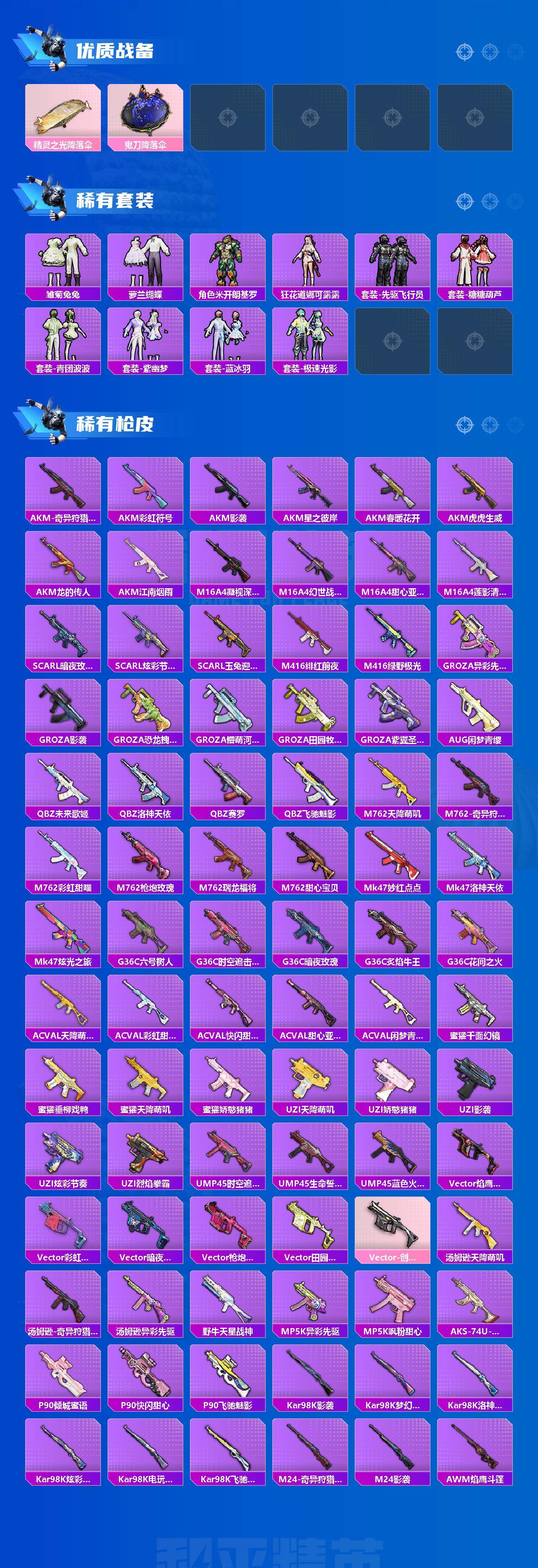 - [15606422]江苏一区-30V-0王者-1炫金 【热门武器】:M4A1-黑骑士,RPK-盘龙*4,加特林-炼狱 【王者炫金武器】:炫金武士 【皮肤】:雷神-神秘按键 皮肤,火麒麟-平天大圣 【角色】:樱,战地猎狐,蛇隐宗,奇洋探员,乔伊教练,修道士,云海玲珑,暗夜-X,北极狐-X,初恋灵狐,芳心审判者,风暴女,嘉年华灵狐,灵动武士,灵狐者-X,灵狐者-七夕宝贝,龙儿,麻雀,曼陀罗-礼服,潘多拉-X,潘多拉-甜心教官,蛇姬,斯沃特-X,蜀雪,铁骑荣耀,兔囡囡,新娜塔莎,雪莉杨,雪莉杨-摸金校尉,夜玫瑰-幻能朋克,影武者-X 【人偶武器】:AWM-灵狐-15周年嘉年华,迷你深渊冰龙,迷你裂空之翼,迷你波特博士,夺魂,迷你牛牛*4,生化手雷-机甲核心*3,深渊终结者手雷,迷你艾比,迷你超能女侍,迷你巨石泰坦-魔花研究所 【挑战大师】:神圣爆裂者III,冰龙粉碎者-白马银枪,VEPR-12-金魔*2,激光毁灭者III*3,机甲撕裂者III,试炼破坏者III,KAC-圣炎切割者III,神圣爆裂者-末日III*2,阐释者III*3 【英雄级武器】:AK47-火麒麟,M4A1-黑骑士,无影-神兵利器,M4A1-玫瑰精灵,黑骑士-海王,Barrett-电竞装甲,Barrett-金色蔷薇,RPK-盘龙*4,加特林-炼狱,柯尔特-电竞装甲,麒麟刺*2,高爆手雷-古蛇迷踪,烟雾弹-古蛇迷踪,M4A1-赤狱骑士,AWM-昌龙*2,Barrett-碧霄极光*2 【道具】:BS战队炫彩背包,CFS限定背包,云山科技背包,亚洲杯纪念炫彩背包,冰冰企鹅背包,机械魔影背包-红色,炫彩背包-诺拉,虎牙炫彩背包,超级背包,黄金巨石泰坦-魔花研究所背包,黄金曼提柯尔的背包,女皇终结者-魔龙之吻,救世主-黑桃战神,黄金生化钩,绿色巨人,灵魂忍者,迷雾幽灵,夺命之镰*2,防化服*4,防弹头盔*3,防弹衣*3,C4工具钳*3,手雷包*3 【特殊枪械】:1黑骑士,4盘龙,1炼狱