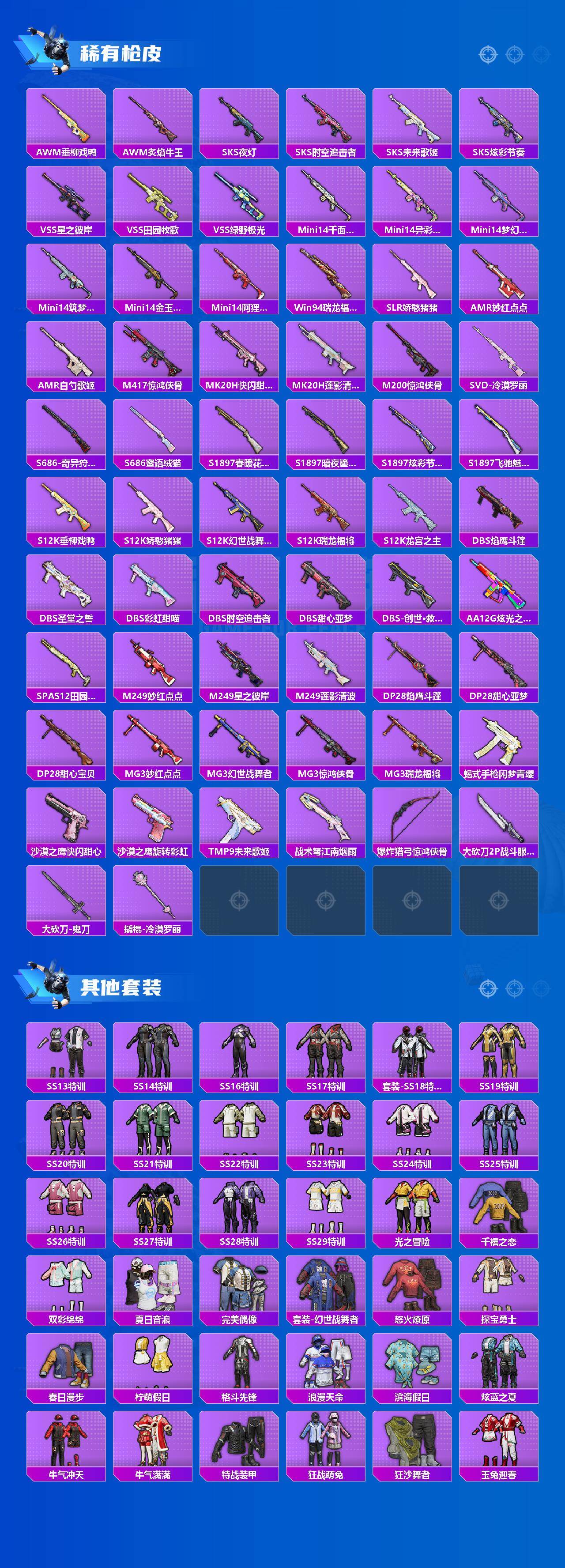 - [12175353]可二次 可修改实名 V2 59英雄武器 1英雄角色 119万化 大师 武器:M200-幻神,MK47-云舞,TAC-晴舞,巴雷特-毁灭,AK47-木兰,AK47-无影,M4A1-雷神,AWM-天使,QBZ03-金色蔷薇,QBZ19-天使,AK47-华夏传说,AK47-血武士,AK12-天启,AWM-天龙,9A91-天神,加特林-蟒蛇,加特林-堡垒,P90-突突兔觉醒,地狱火,AK47-破空冰刃,M4A1-太白诗仙,AN94-赳赳秦师,马来剑-毁灭,尼泊尔-冰锋觉醒,MK47-塔罗牌觉醒,屠龙,唐刀-大唐荣耀,太白诗仙扇,烟雾弹-游骑兵,燃烧弹-游骑兵,闪光弹-游骑兵,AWM-指南针,分裂雷-偃蛇,HK417-炎龙铠甲,手雷-游骑兵,AWM-大湾溢彩,环刃-炫光掠影觉醒