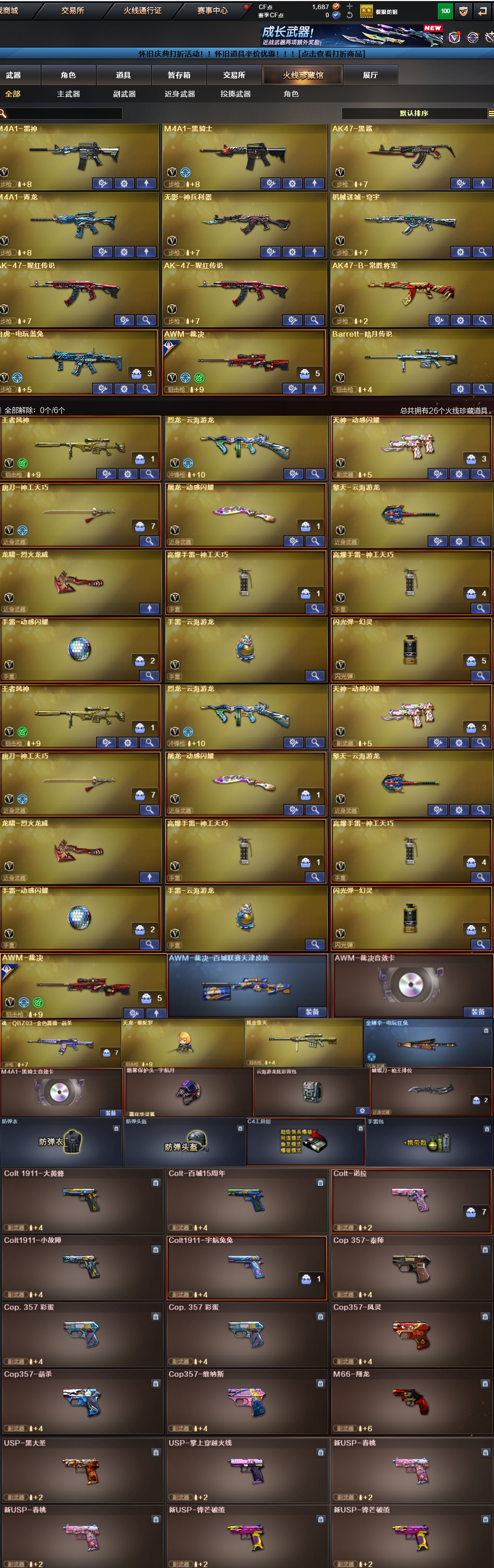 - [14133610]河南一区-37V-10王者-2炫金 【热门武器】:M200-竞技荣光,荣耀世冠-柯尔特,加特林-炼狱,裁决-雪莉杨,USP-雷暴,沙鹰-修罗*3 【王者炫金武器】:雷霆王者之锋*2,炫金骑士,炫金武士 【音效卡】:M4A1-雷神音效卡,Barrett-毁灭音效卡 【稀有皮肤】:雷神-星空,火麒麟-盘古,修罗-星空 【角色】:零,电竞教官-云悠悠,王者-零,零-水下丽影 【人偶武器】:裁决-雪莉杨,迷你波特博士,迷你火种,迷你生化手雷 【挑战大师】:阐释者III 【英雄级武器】:AK47-火麒麟,M4A1-黑龙,M4A1-雷神,AK47-黑武士*3,M4A1-武圣*2,AWM-天龙,Barrett-毁灭,Barrett-极光,AWM-裁决,Barrett-朱雀,M200-竞技荣光,加特林-炼狱,AA-12-雷霆,沙鹰-修罗*3,沙鹰-天神,USP-雷暴,柯尔特-竞技荣光,荣耀世冠-柯尔特,屠龙,擎天,麒麟刺*2,擎天-竞技荣光,高爆手雷-竞技荣光*2,闪光弹-竞技荣光*2,烟雾弹-竞技荣光*2 【特殊枪械】:1炼狱