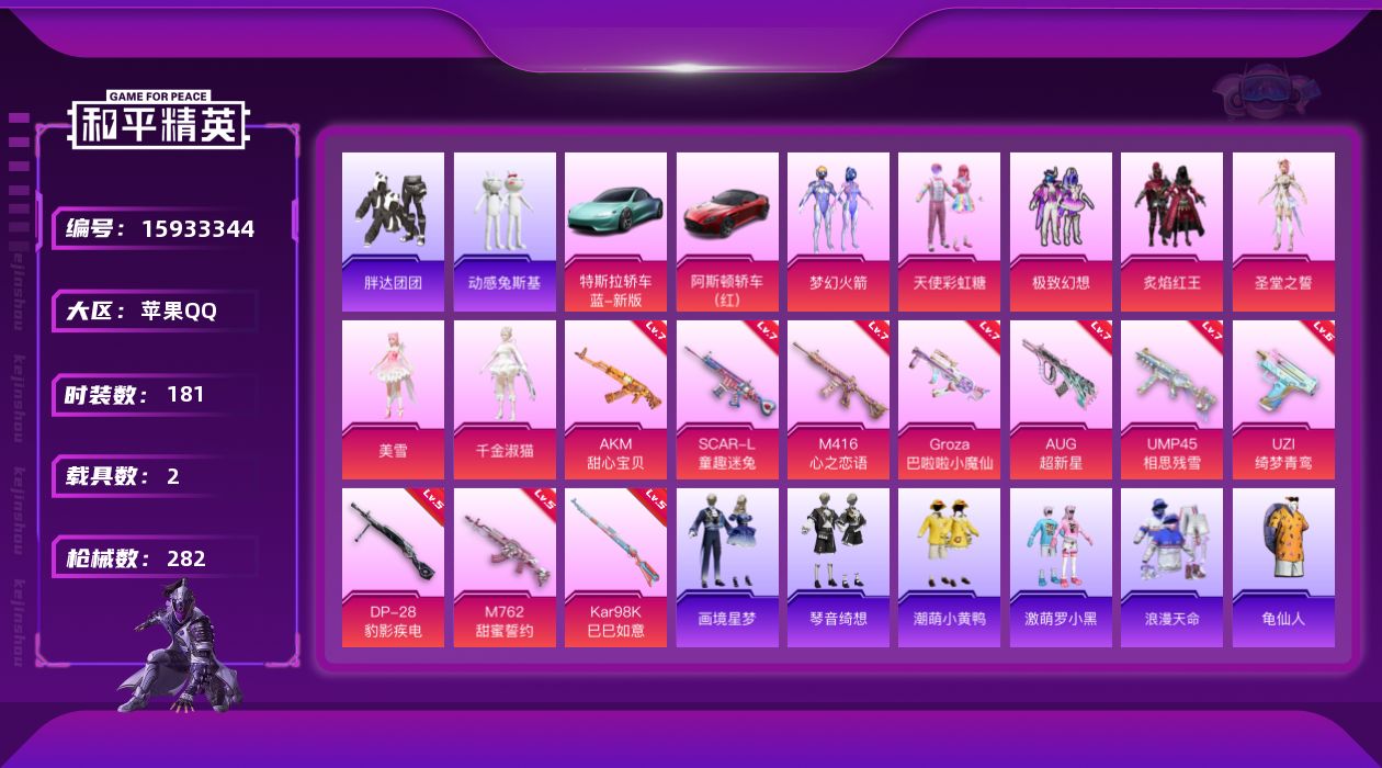 - PX_2077320- 苹果手Q-17王牌印记-6粉装-4特效枪-3载具-91138热力值-185套装-236枪皮-2卓越印记-0传奇印记 【6粉装】,梦幻火箭,怪诞乔克,雪月幻音,炫光之旅,守护天翼,烟云彩露 【4特效枪】AKM-幽焰骑士-3级 AUG-暖羊咩咩-5级 Kar98K-巳巳如意-5级 Vector-最终圣卫者-1级 【2红装】,最终圣卫者-帕修斯/3级,幽焰骑士-维塔/1级, 【