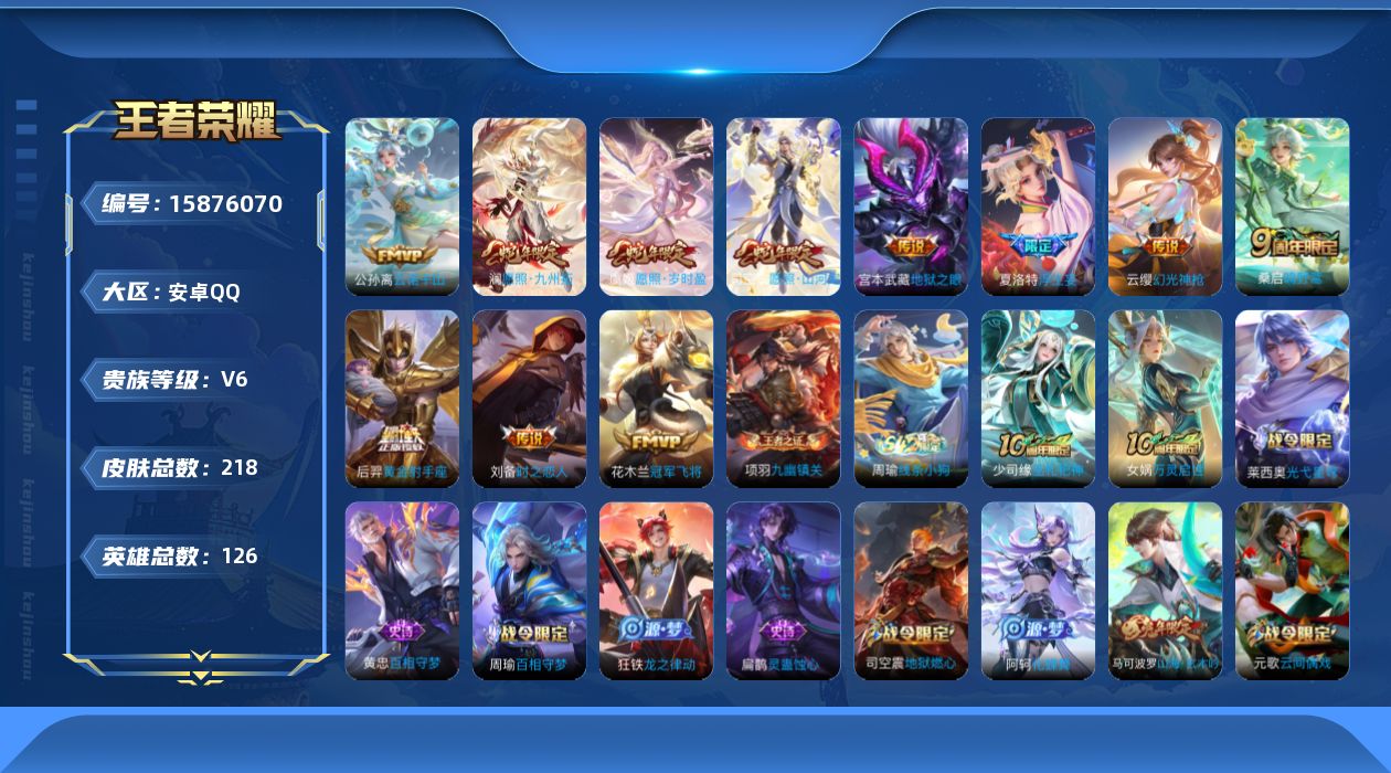 [15876070]安卓Q-V6-至尊星耀II段位-126英雄-218皮肤-12传说-59史诗